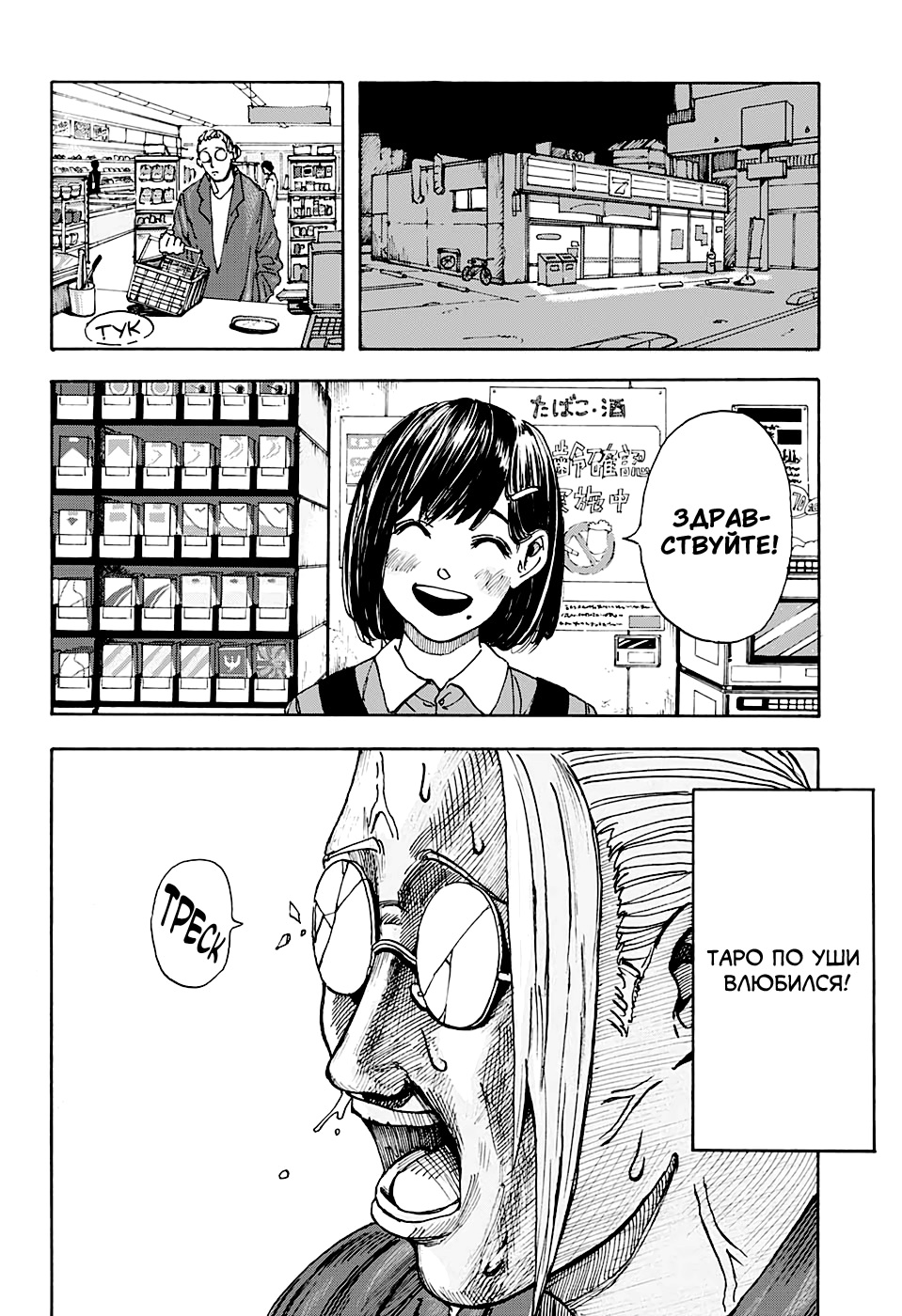Так по сюжету у нас тут был супер-мега крутой наёмник, которому не было равных и звали его Сакамото. И вот в один день зайдя в магазинчик, он по уши влюбился в кассиршу и чтобы быть с ней он бросил своё дело, завёл семью, открыл свой магазинчик и…
