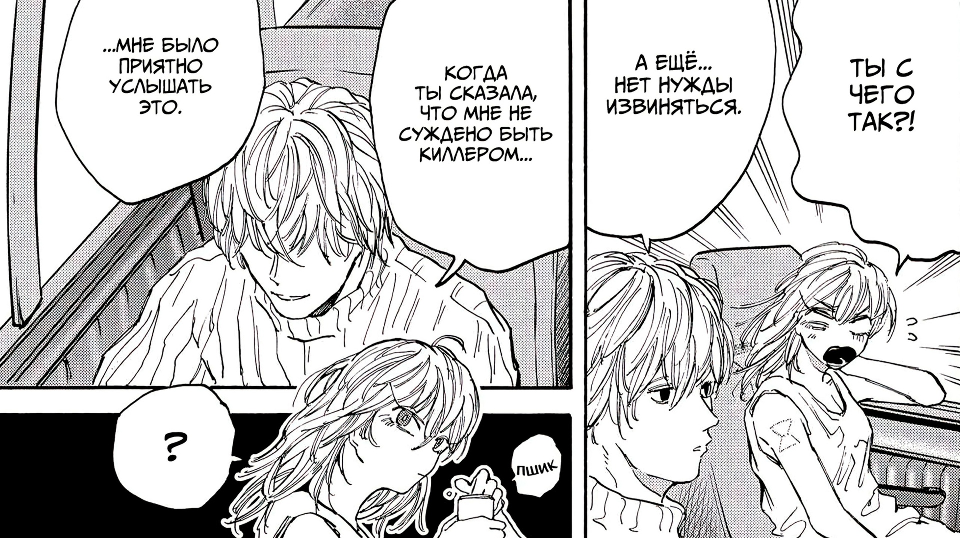 По персонажам тут в принципе они все классные, не сказал бы что они капец каким глубоким характером и предысторией обладают, однако я же говорил, что это комедийная манга, и вот в плане развлечь зрителей веселыми репликами и колкостями, а также смешными ситуациями, персонажи отлично справляются и за ними интересно и весело наблюдать. Но иногда есть и такие моменты, что прямо за душу берёт, что прямо такая жиза, что аж слёзы приступают к глазам, как вот этот короткий фрагмент: