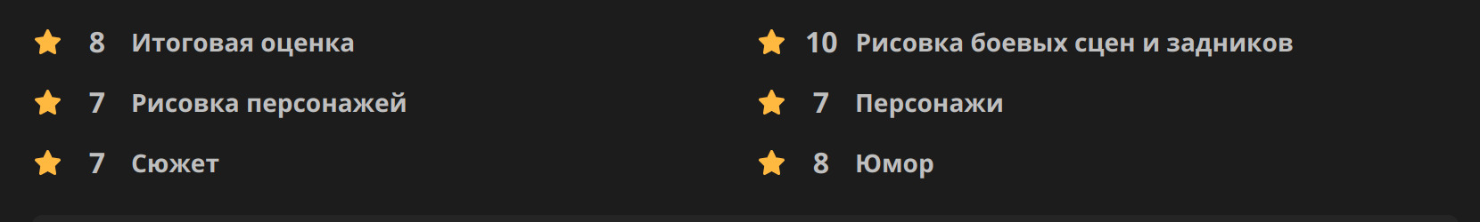 А вот такие оценки я бы поставил тайтлу за его достоинства и недостатки: