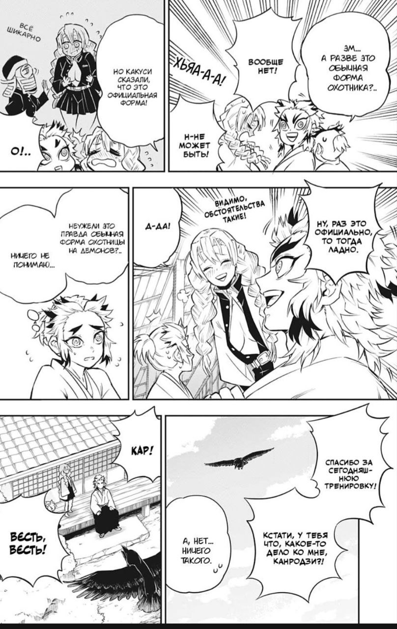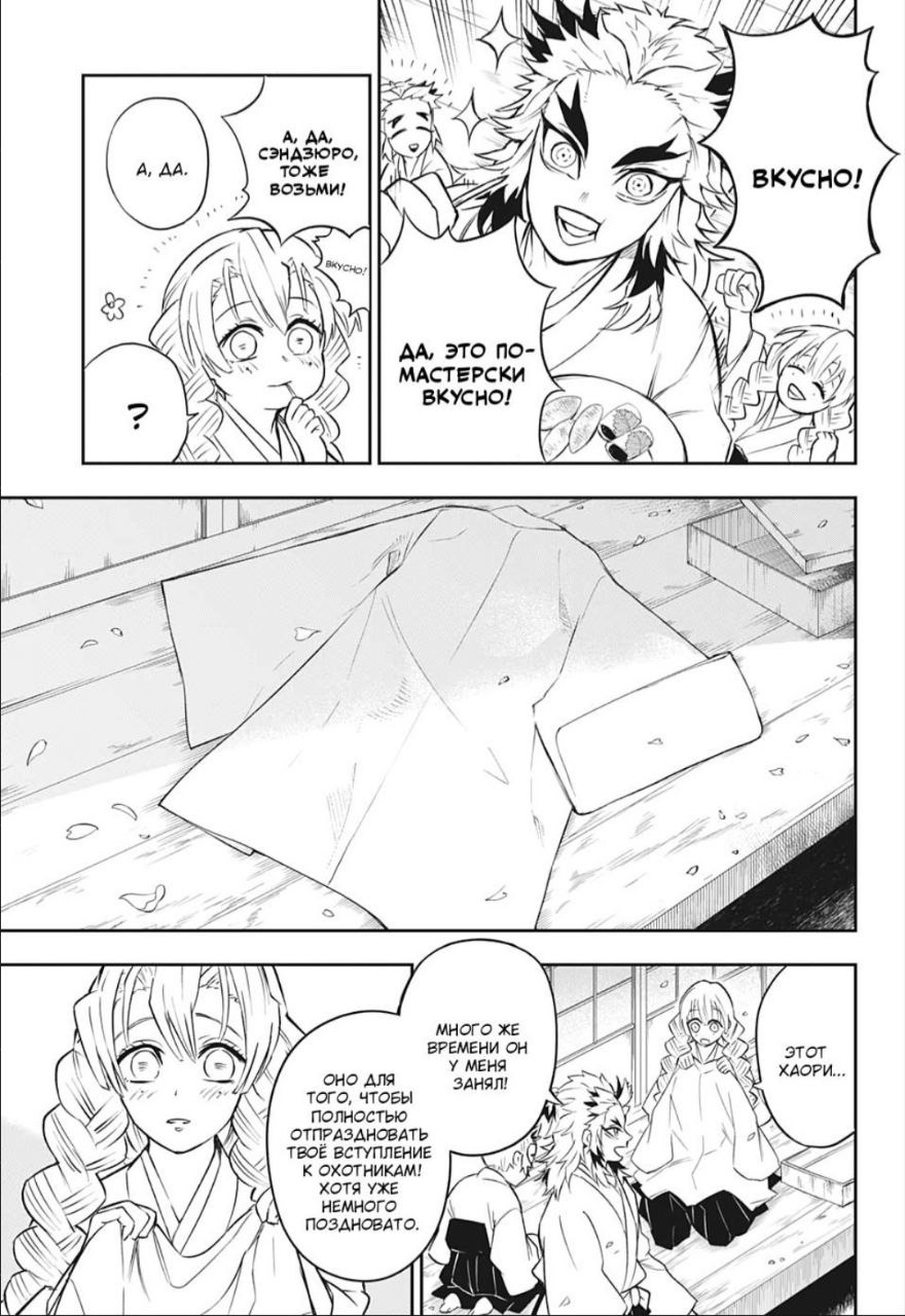 Нам показали, как Мицури получила свою форму или то, что ее Хаори сшил младший брат Ренгоку ( правда, жаль, что оно без какого-либо дизайна, было бы более символично, если бы там было что-то вышито)