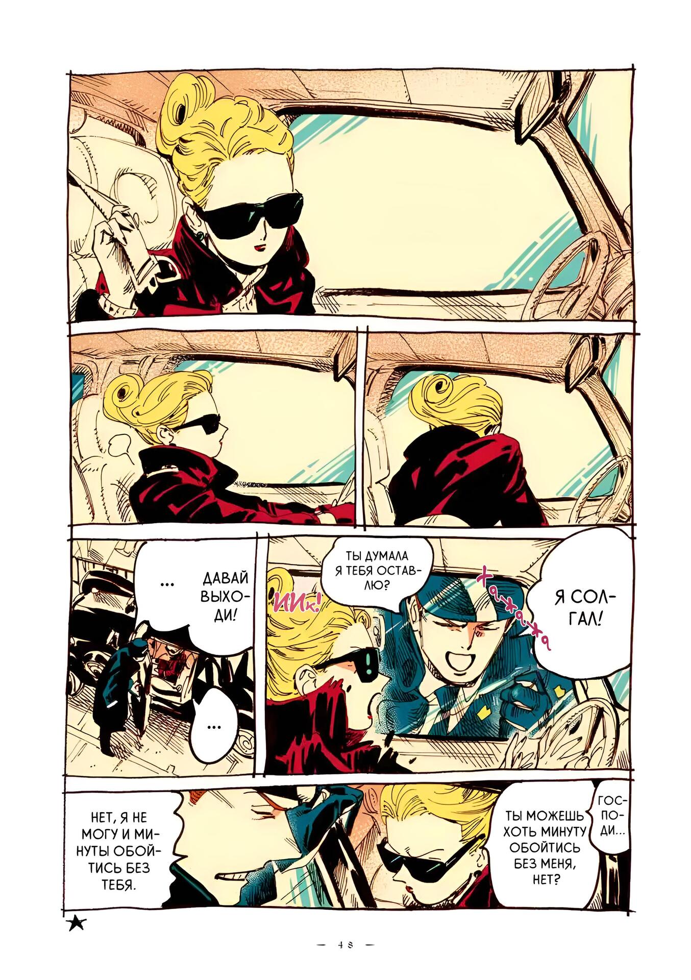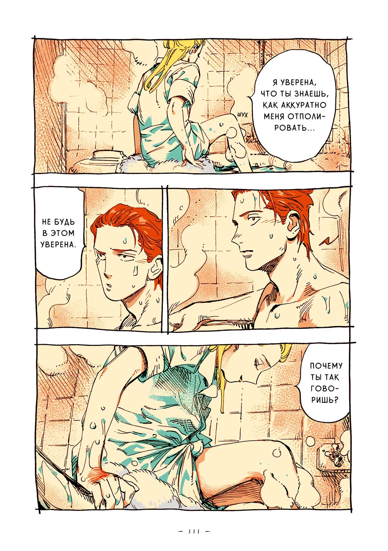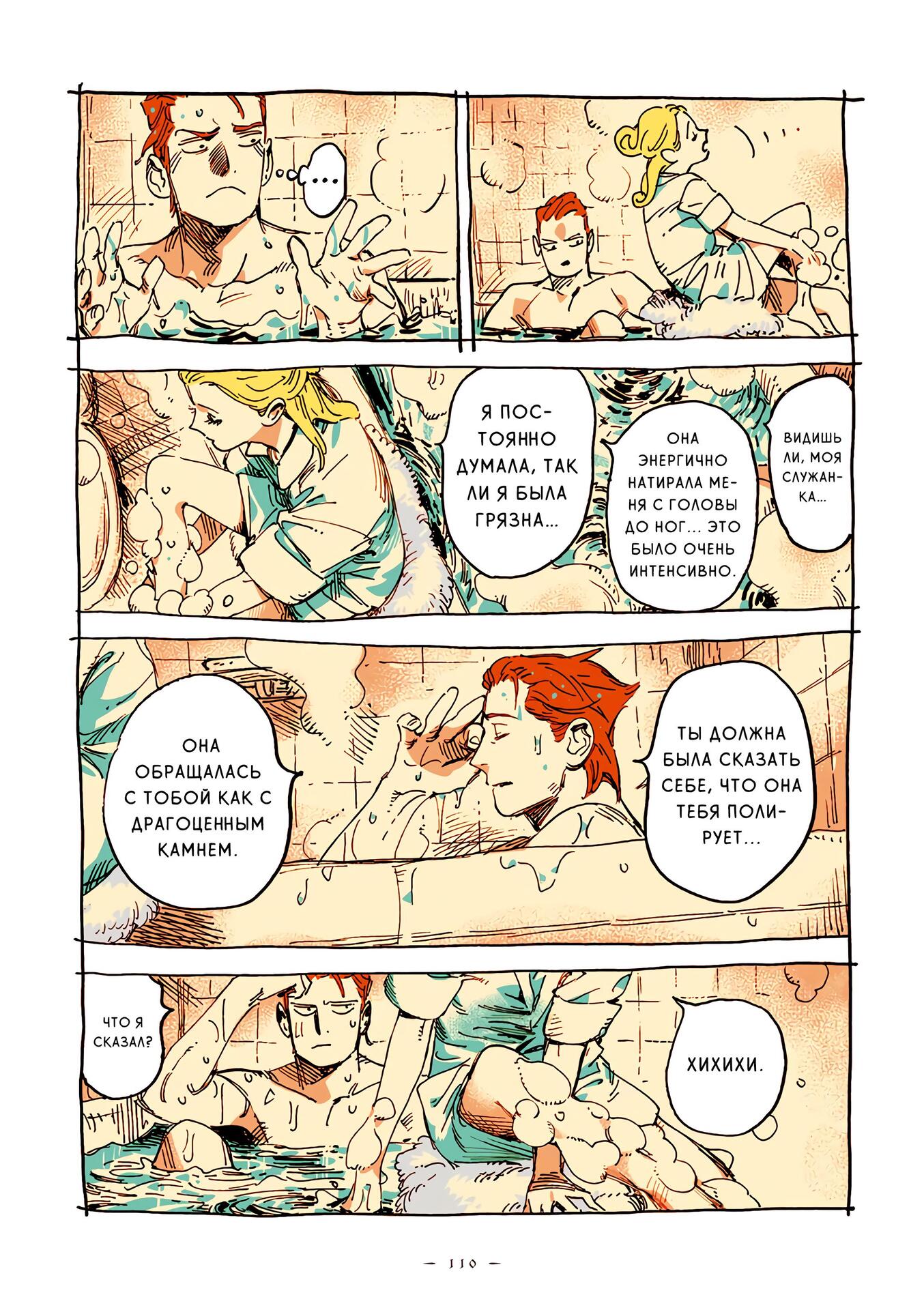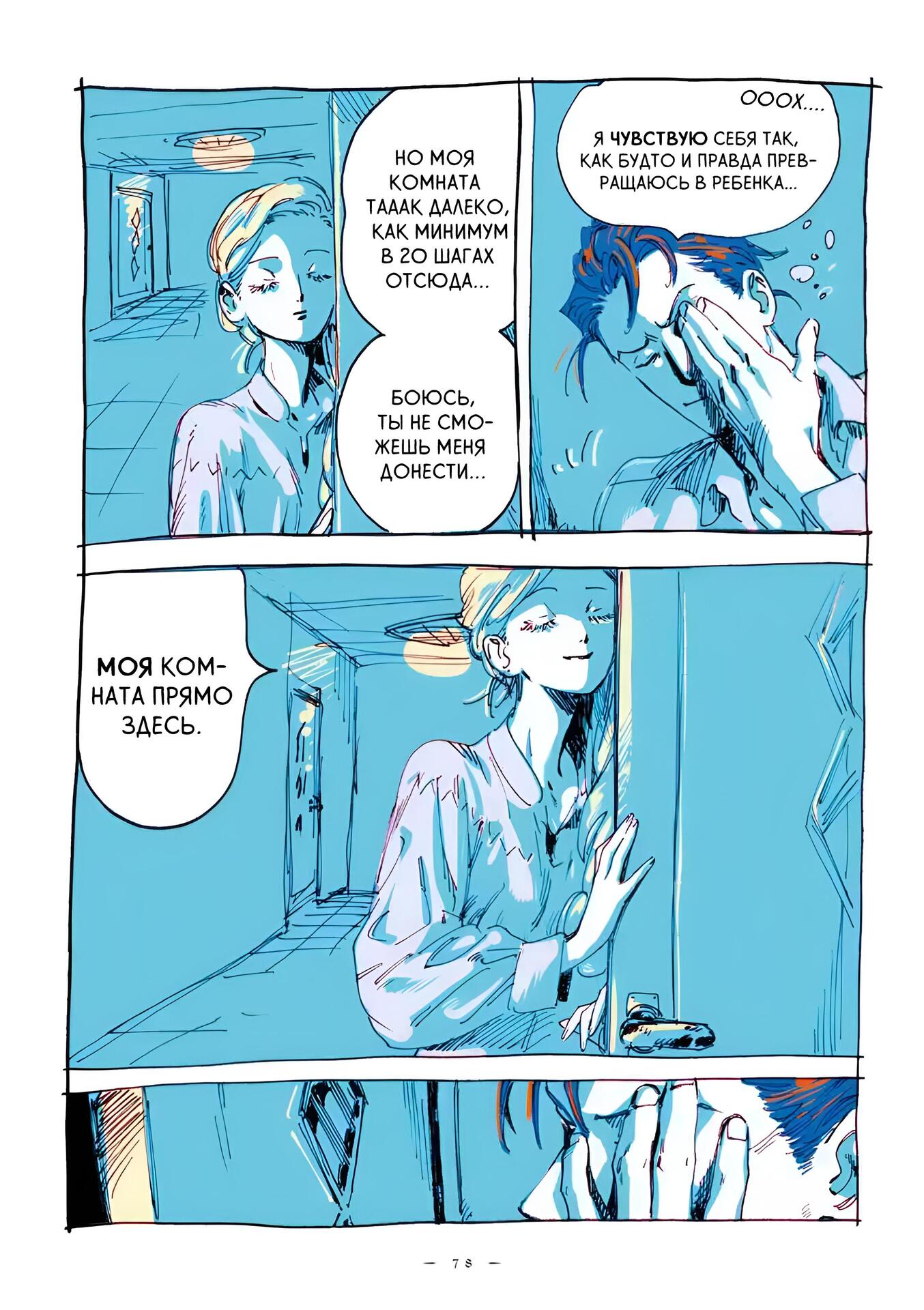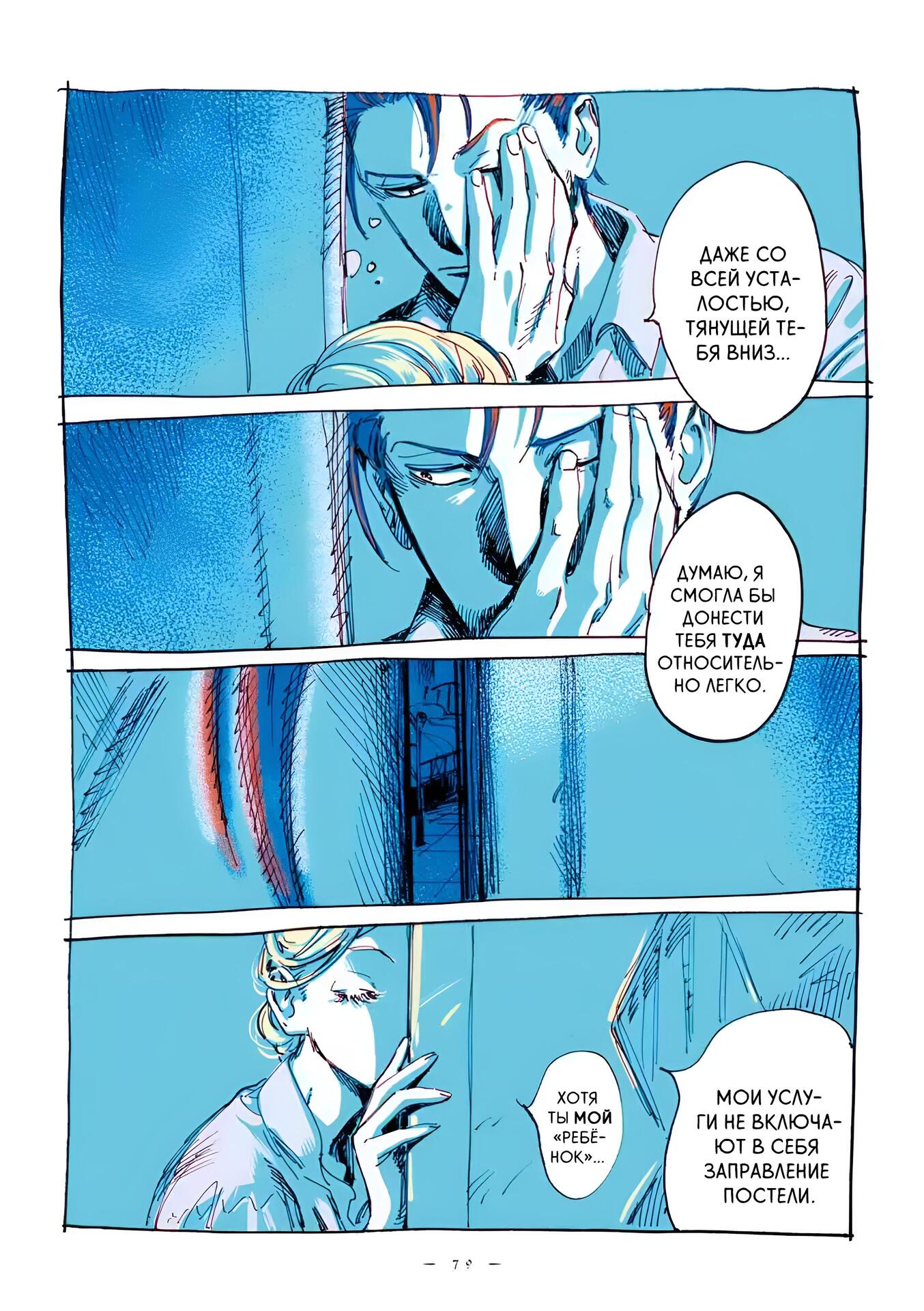 Впечатление рисовки, и, о боже, она восхитительна я уже упоминал, что манга полностью цветная, но мне нравится то, как автор использует её, например на этих панелях изображён светло-голубой цвет приятная и прохладная ночь и задаёт настроение и температуру сцены, вы можете увидеть сонливость Эммы и Александра, когда они общаются перед сном.