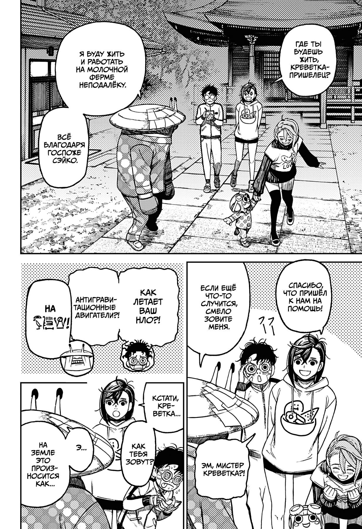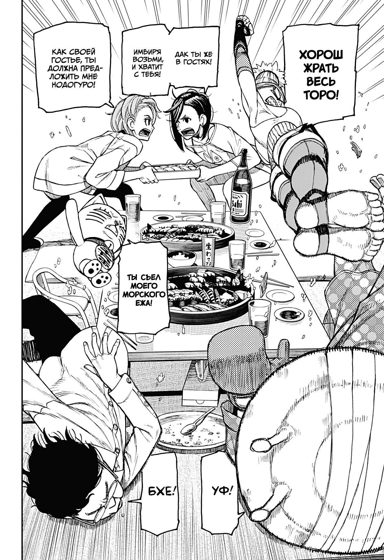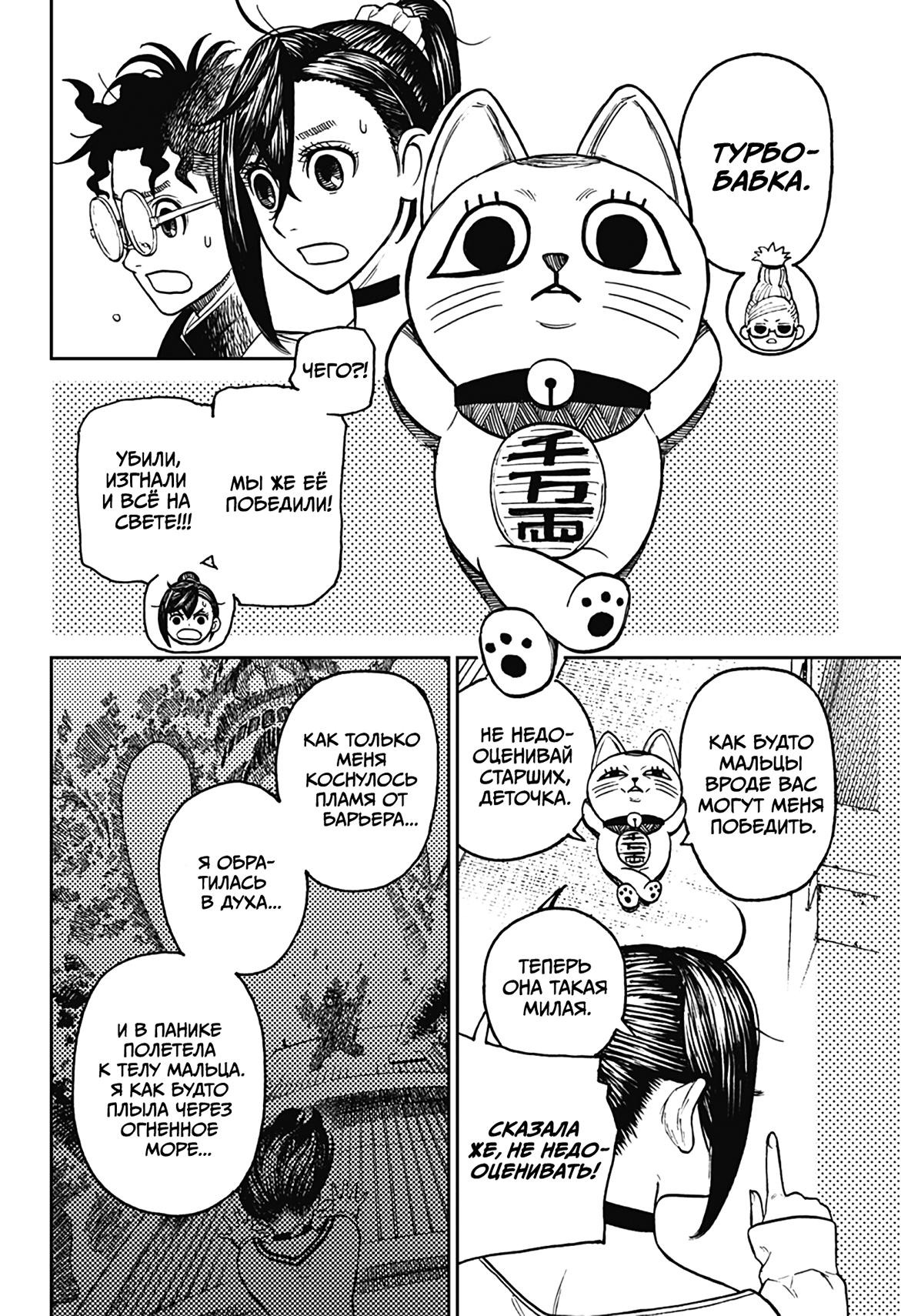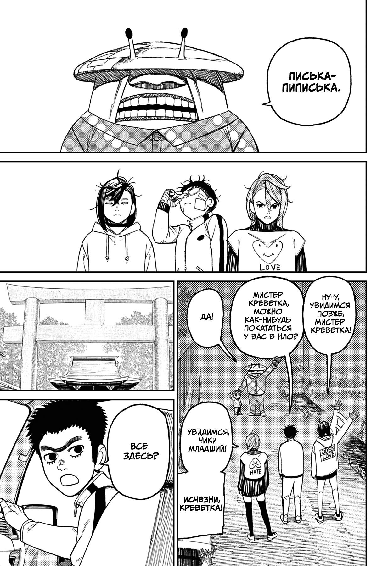 А теперь немного субъективного. Буквально ВСЕ персонажи ведут себя как неадекватные гиперактивные стереотипные СДВГшники (к реальным людям с этим диагнозом ноль претензий и негатива) в самом худшем проявлении. Каждый персонаж постоянно, вот просто ПОСТОЯННО кривляется, корчит рожи, орет, истерит, пошло шутит, выдает какой-то кринж. Причем делают они это абсолютно одинаково вне зависимости от архетипа. Скромный забитый омеган будет орать и кривляться ТОЧНО ТАК ЖЕ, как и популярный красивый спортсмен, цундере будет орать и злиться РОВНО ТАК ЖЕ как и наивная не обремененная интеллектом девочка. В тех же выражениях, с теми же самыми эмоциями. И нет, это опять же не тянет на слом клише и выход за рамки архетипа, ибо это не полноценный рост и изменения, а чисто втф-моменты ради втф -моментов. И это нереально выматывает. Моментов, где персонажи просто спокойно садятся и что-то обсуждают, говорят о чем-то по душам можно пересчитать по пальцам, зато какой-то дикий кринж они вытворяют почти на каждой странице. И я не против абсурдного юмора, я не против мемных юморных вставок, в конце концов я более чем котирую "Жожу", в которой очень много абсурдных мемных моментов. Но они там не занимают подавляющую часть повествования, они там именно что порой его разбавляют, а от того запоминаются. В "Дандадан" по ощущениям наоборот кринжовую вакханалию изредка разбавляют проблески адекватности, и читать это просто физически сложно.