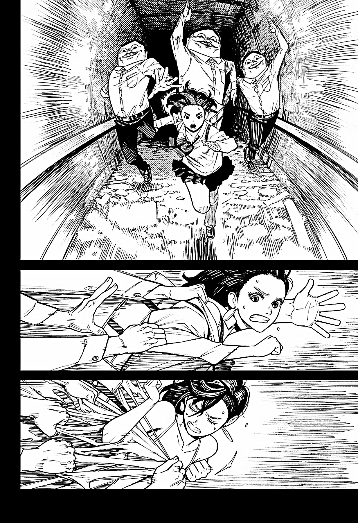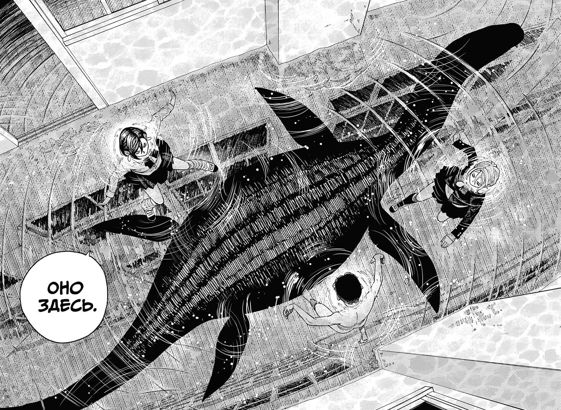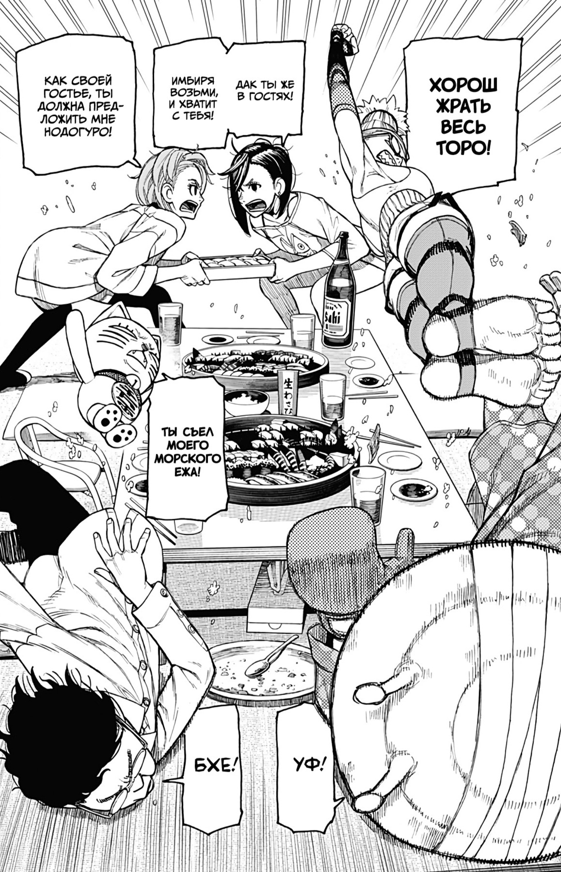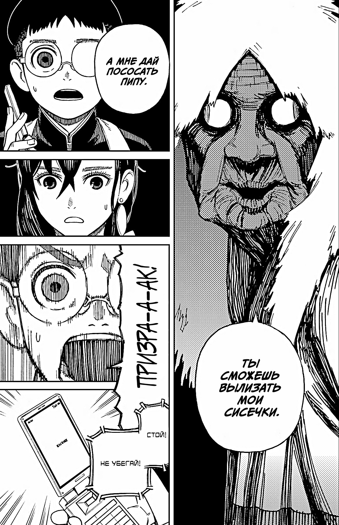 А теперь немного субъективного. Буквально ВСЕ персонажи ведут себя как неадекватные гиперактивные стереотипные СДВГшники (к реальным людям с этим диагнозом ноль претензий и негатива) в самом худшем проявлении. Каждый персонаж постоянно, вот просто ПОСТОЯННО кривляется, корчит рожи, орет, истерит, пошло шутит, выдает какой-то кринж. Причем делают они это абсолютно одинаково вне зависимости от архетипа. Скромный забитый омеган будет орать и кривляться ТОЧНО ТАК ЖЕ, как и популярный красивый спортсмен, цундере будет орать и злиться РОВНО ТАК ЖЕ как и наивная не обремененная интеллектом девочка. В тех же выражениях, с теми же самыми эмоциями. И нет, это опять же не тянет на слом клише и выход за рамки архетипа, ибо это не полноценный рост и изменения, а чисто втф-моменты ради втф -моментов. И это нереально выматывает. Моментов, где персонажи просто спокойно садятся и что-то обсуждают, говорят о чем-то по душам можно пересчитать по пальцам, зато какой-то дикий кринж они вытворяют почти на каждой странице. И я не против абсурдного юмора, я не против мемных юморных вставок, в конце концов я более чем котирую "Жожу", в которой очень много абсурдных мемных моментов. Но они там не занимают подавляющую часть повествования, они там именно что порой его разбавляют, а от того запоминаются. В "Дандадан" по ощущениям наоборот кринжовую вакханалию изредка разбавляют проблески адекватности, и читать это просто физически сложно.