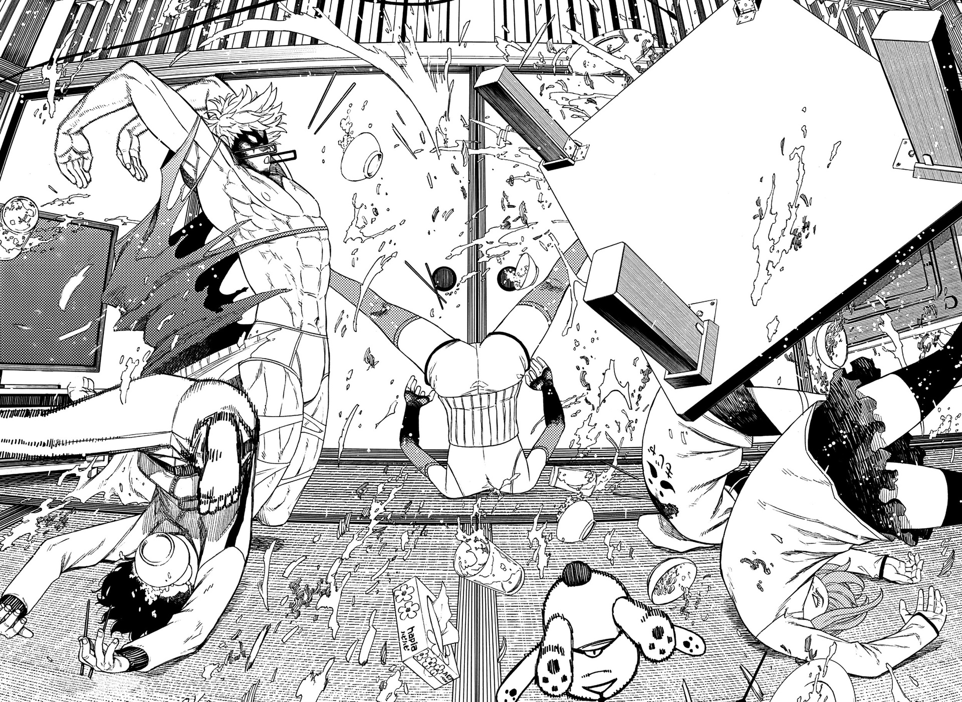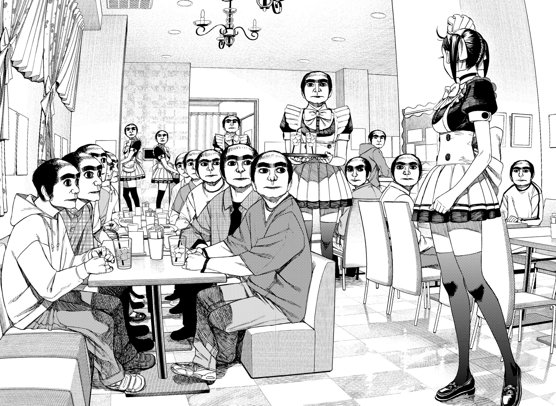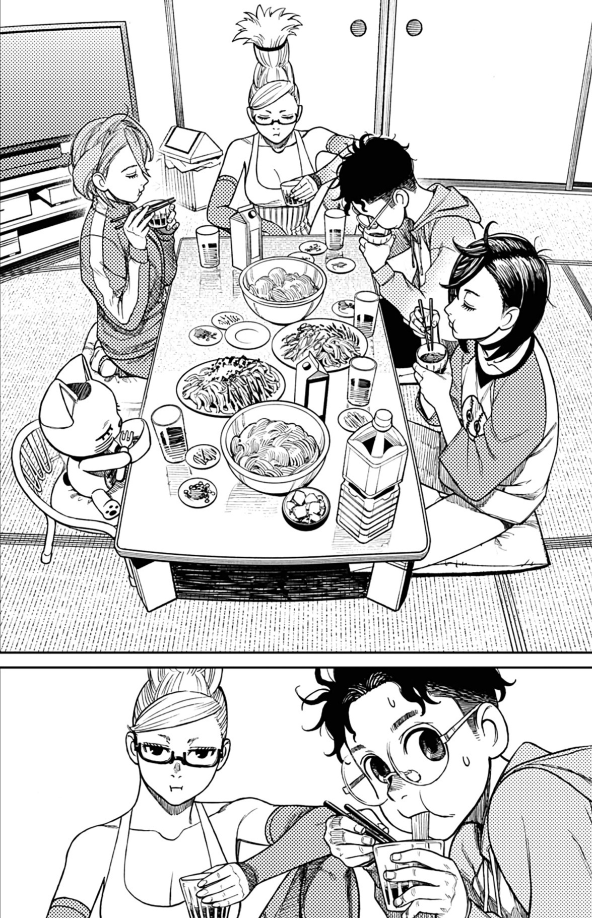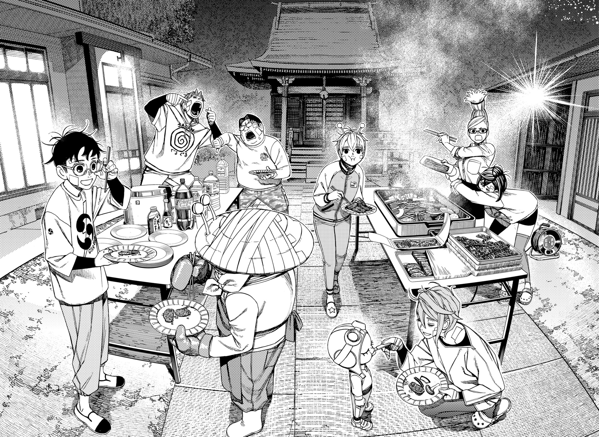 А теперь немного субъективного. Буквально ВСЕ персонажи ведут себя как неадекватные гиперактивные стереотипные СДВГшники (к реальным людям с этим диагнозом ноль претензий и негатива) в самом худшем проявлении. Каждый персонаж постоянно, вот просто ПОСТОЯННО кривляется, корчит рожи, орет, истерит, пошло шутит, выдает какой-то кринж. Причем делают они это абсолютно одинаково вне зависимости от архетипа. Скромный забитый омеган будет орать и кривляться ТОЧНО ТАК ЖЕ, как и популярный красивый спортсмен, цундере будет орать и злиться РОВНО ТАК ЖЕ как и наивная не обремененная интеллектом девочка. В тех же выражениях, с теми же самыми эмоциями. И нет, это опять же не тянет на слом клише и выход за рамки архетипа, ибо это не полноценный рост и изменения, а чисто втф-моменты ради втф -моментов. И это нереально выматывает. Моментов, где персонажи просто спокойно садятся и что-то обсуждают, говорят о чем-то по душам можно пересчитать по пальцам, зато какой-то дикий кринж они вытворяют почти на каждой странице. И я не против абсурдного юмора, я не против мемных юморных вставок, в конце концов я более чем котирую "Жожу", в которой очень много абсурдных мемных моментов. Но они там не занимают подавляющую часть повествования, они там именно что порой его разбавляют, а от того запоминаются. В "Дандадан" по ощущениям наоборот кринжовую вакханалию изредка разбавляют проблески адекватности, и читать это просто физически сложно.