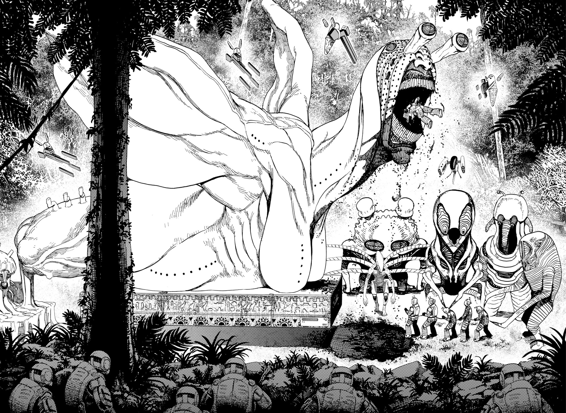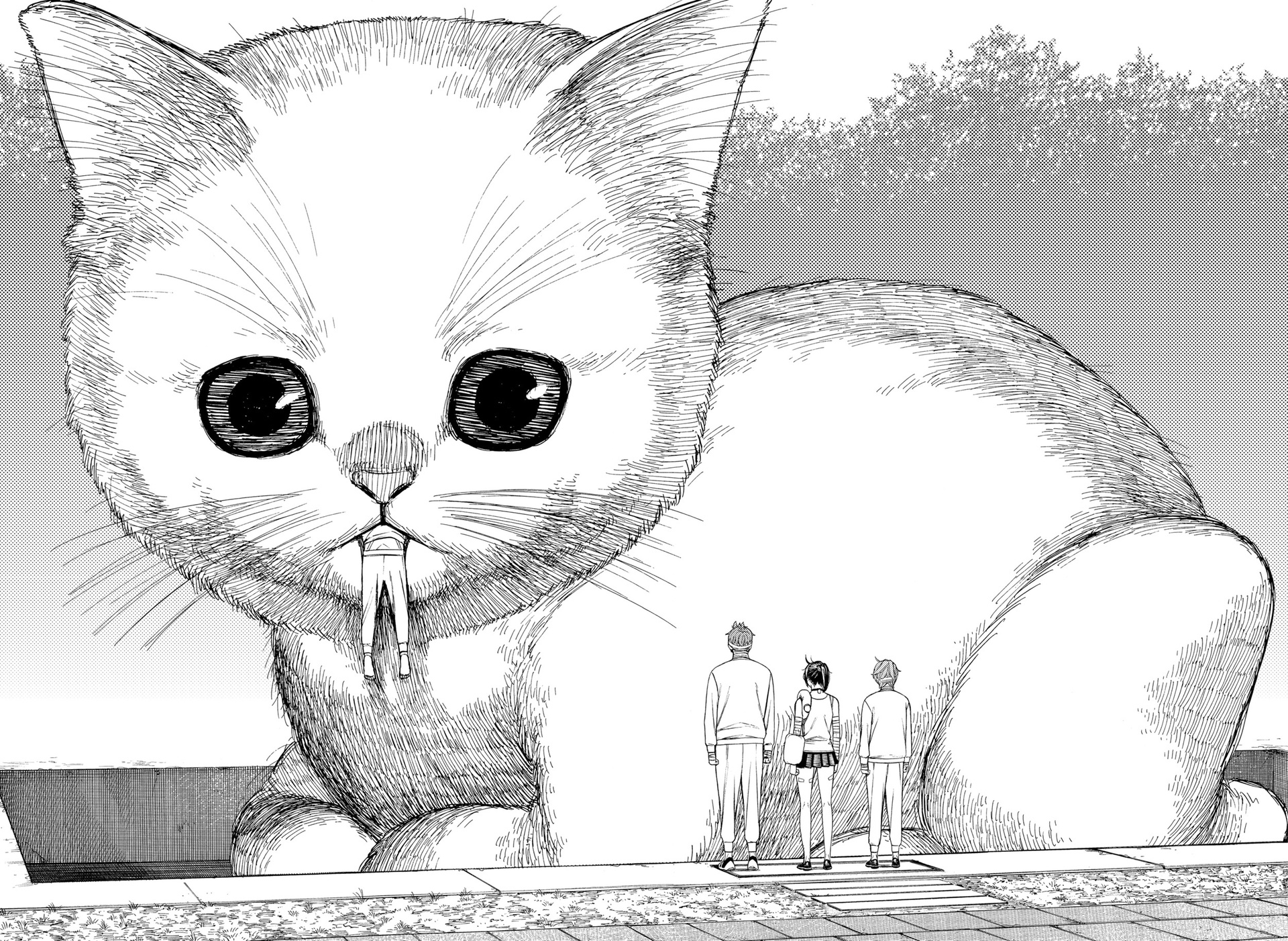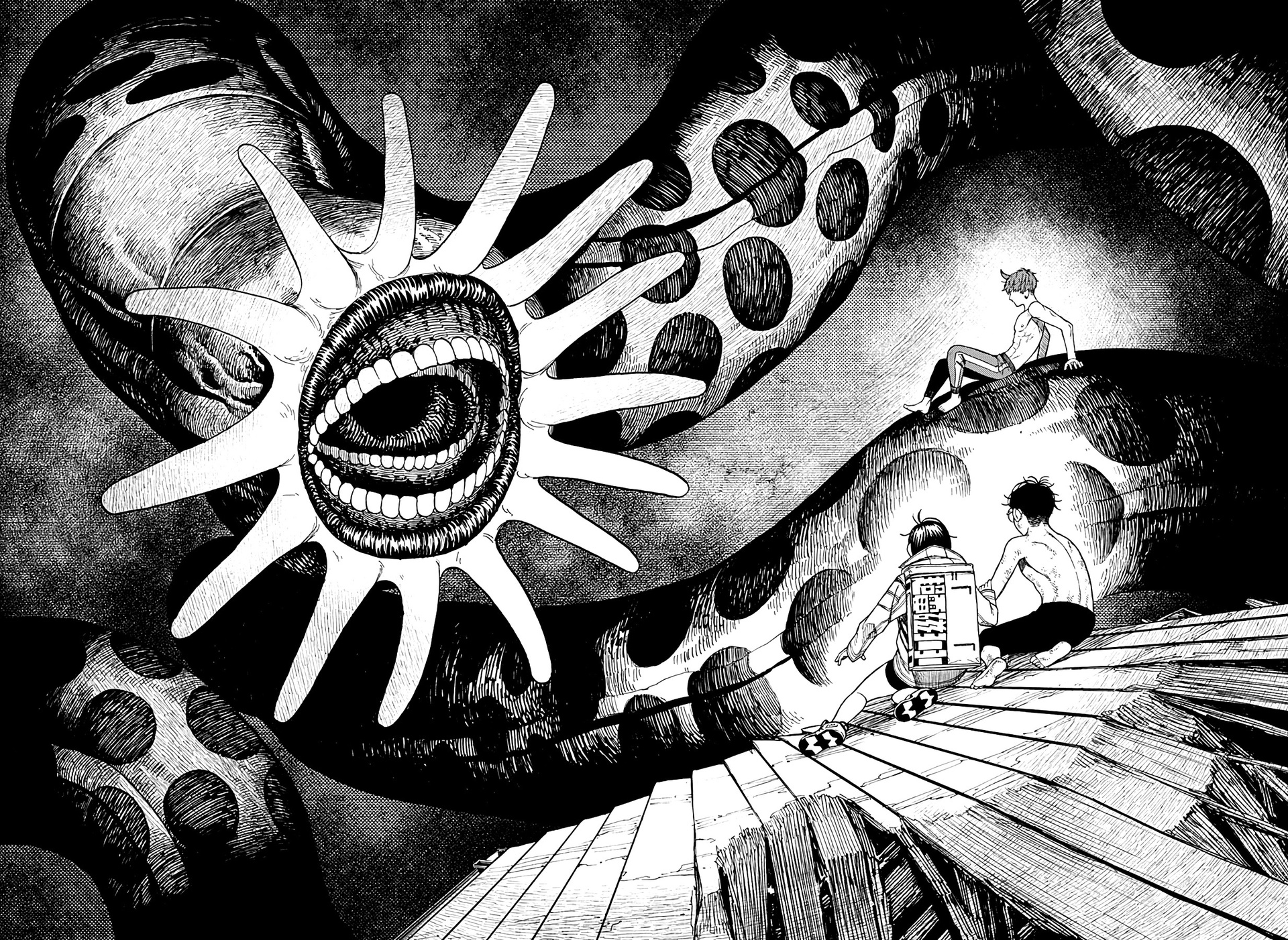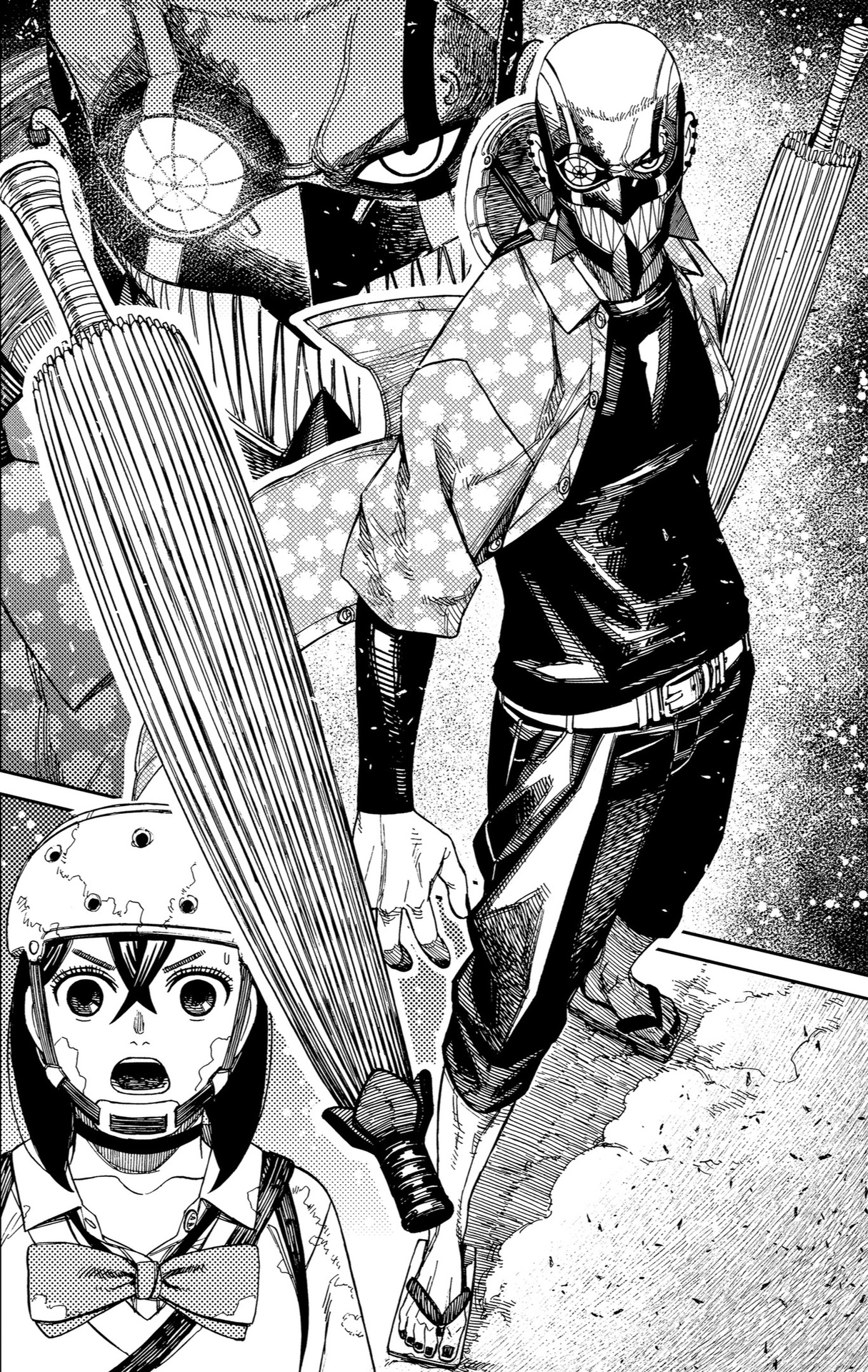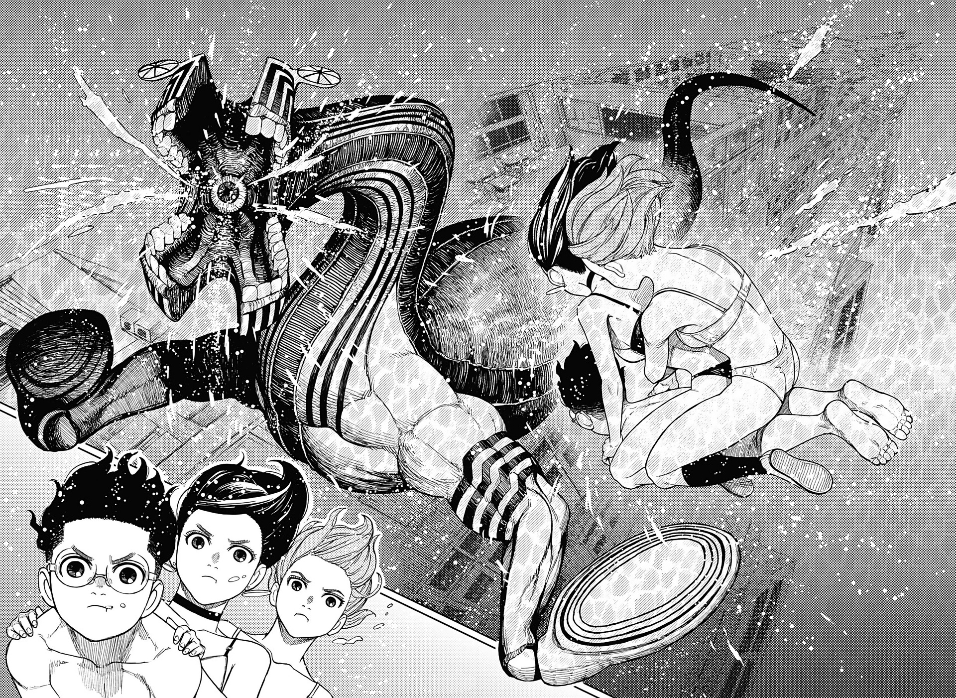 Быть может, в "Дандадан" уникальная проработанная вселенная с нетипичным лором? Не, это городское фентези о подростках с суперспособностями в современной Японии, которые сражаются с демонами. "Синий экзорцист", "Бездомный бог", "За гранью", да даже, будь она неладна, "Бензопила". Список, где у нас было то же самое, кажется, можно продолжать бесконечно. Но может "Дандадан" предлагает какую-то уникальную концепцию этих всех демонюг, продуманную мифологию данной вселенной? Не, даже близко нет ничего подобного. У нас тут и екаи - без какой-либо системы и иерархии, и Лох-несское чудовище, и кайдзю, и окололавкрафтовщина. Смешались в кучу кони, люди, и этот коктейль из разных мифов и легенд даже никак интересно не обыгрывается и не деконструируется. Может, разнообразия привнесет существование во вселенной инопланетян? Ну...они просто есть и нужны ради шюток про похищение гениталий. Опять же, никаким продуманным лором там и не пахнет. Один раз вкидывается мысль о том, что екаи защищают землю от инопланетян, но развития эта мысль на момент 50-й главы не получает, и вообще это всего лишь теория одного из гг.