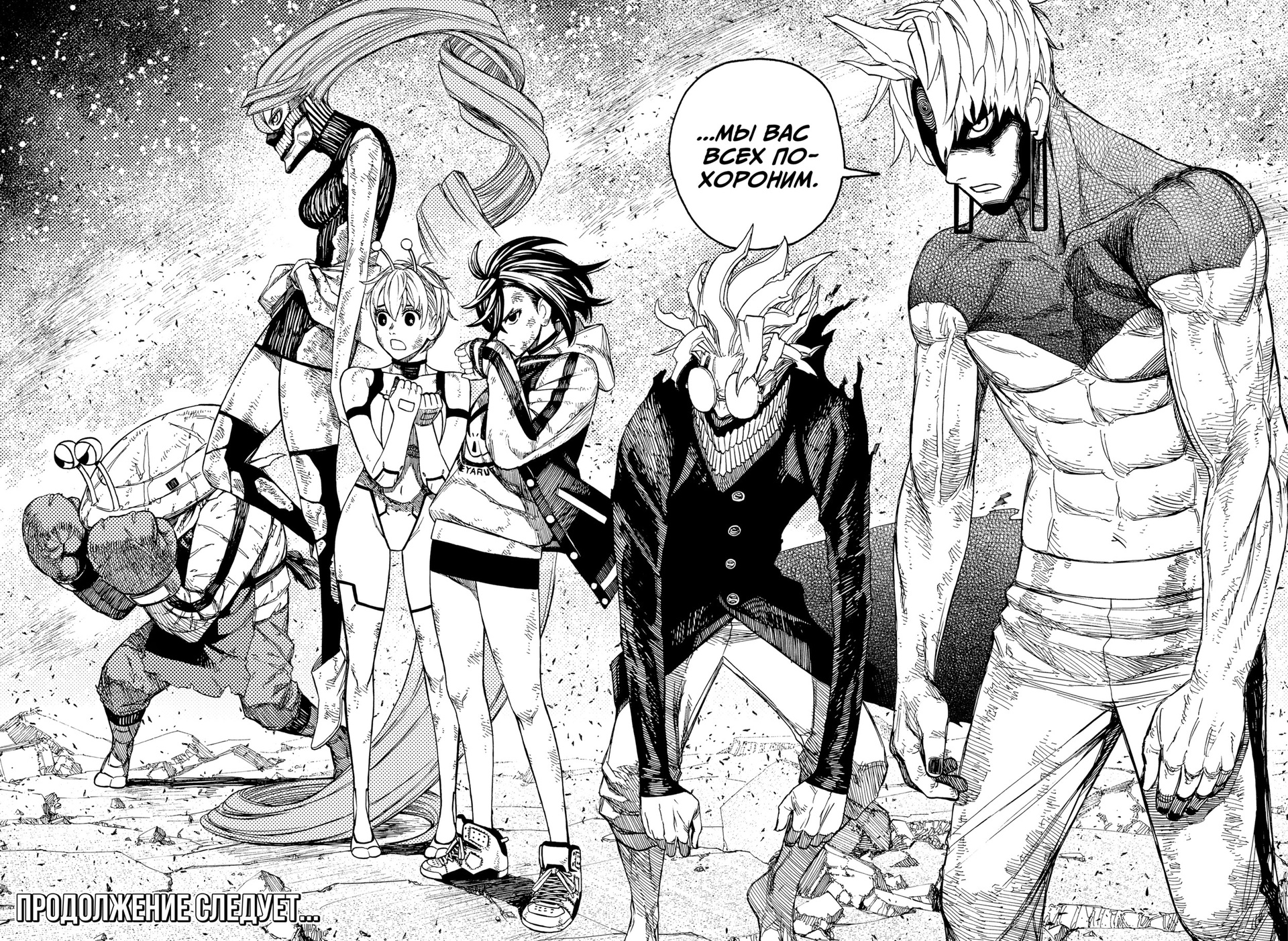Но, быть может, даже в не особо продуманном и уникальном мире нас будет ждать динамичное приключение со множеством интересных поворотов и постоянно растущими ставками? Тут буду кратка - глобального сюжета как такового нет. Есть завязка, в которой герои понимают, что мир кишит духами и инопланетянами и получают сверхсилы, а главный герой теряет свои яйца, которые теперь надо найти. Получив этот "основной квест", герои в лучших традициях "Скайрима" и прочих игр беседки забивают на него и идут по "побочкам" и "случайным событиям". Все, дальше у нас структура повествования - "битва с боссом каждый день", которую можно раскручивать и доить хоть до бесконечности, как какой-нибудь "Ван-пис", и в которой уже написано 209 глав.