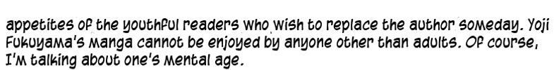 Однозначно, манга не для тех кому меньше 30-и. Тут надо додумывать мысль автора и просто думать, а не плыть по течению манги. Сразу можно сказать, манга тяжелая, скорее драма.