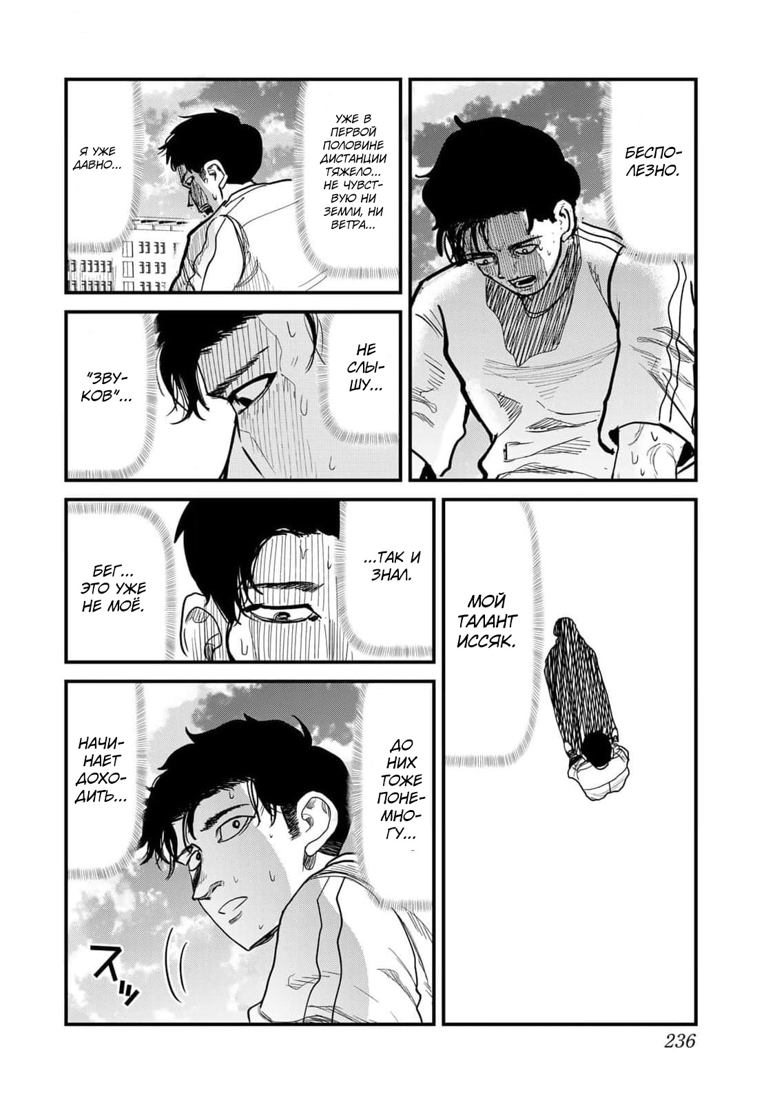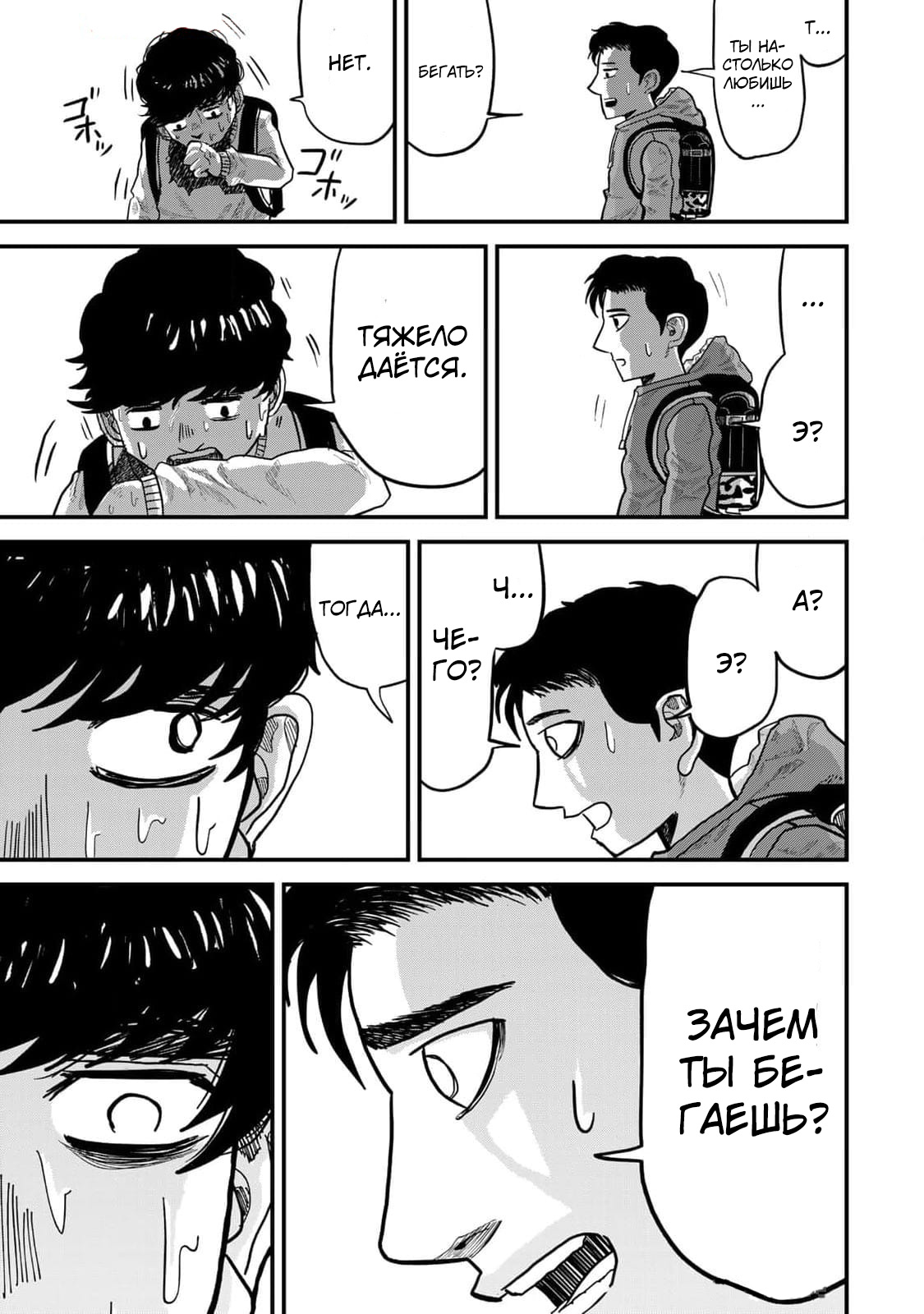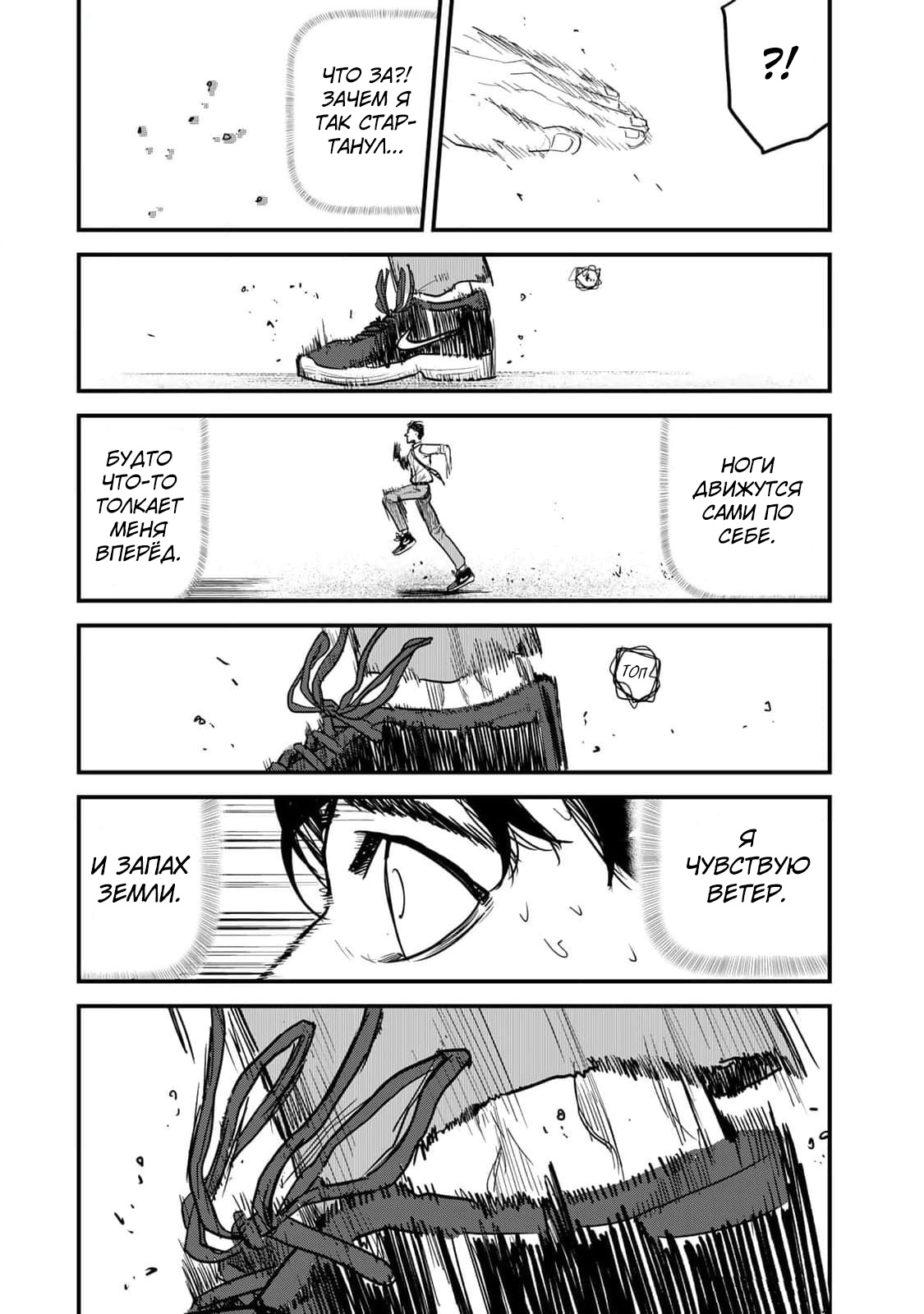 Однажды Тогаси снова застаёт Комию за тем же — он бежит по улице с безумной решимостью, пока не падает от изнеможения. Между мальчиками завязывается разговор, который приводит к ключевому вопросу: "Тебе нравится бегать?" — и тому самому диалогу, который покорил меня с первых строк.