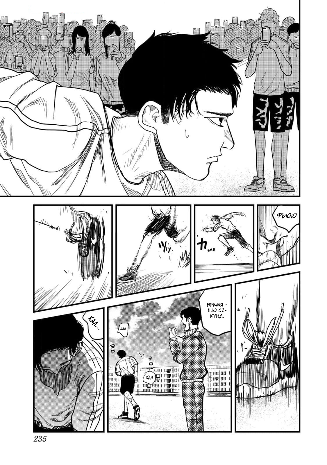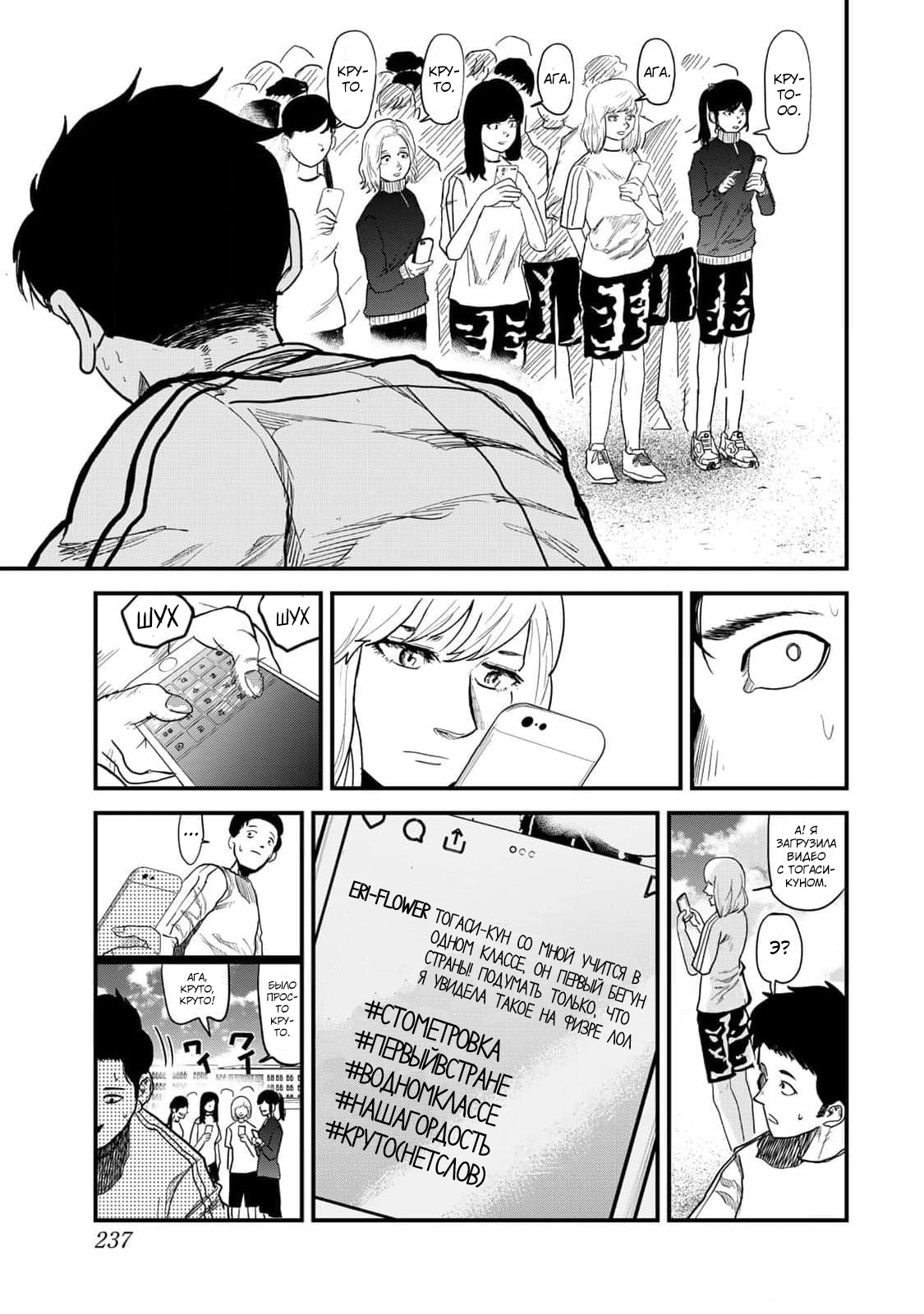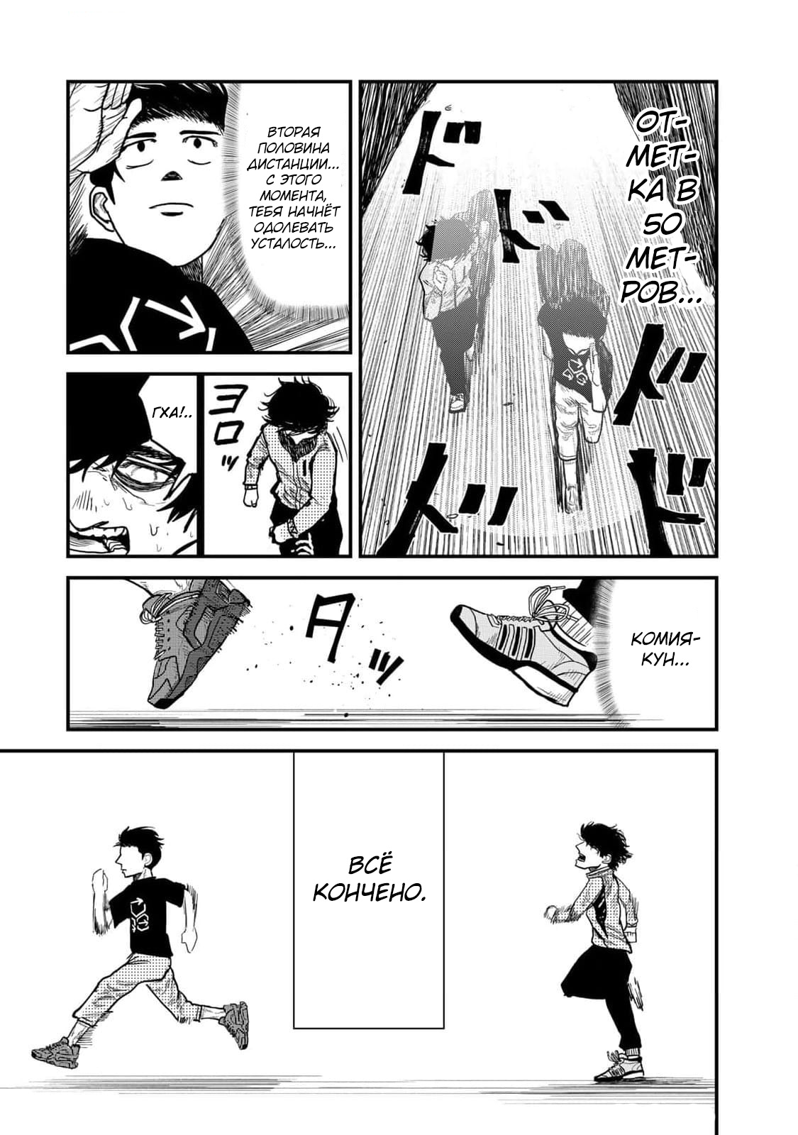 Вскоре выяснилось, что это новый ученик в их классе — Комия. Тихий, забитый мальчик, который сразу же стал объектом насмешек. Хотя Тогаси не участвовал в травле, он не мог не заинтересоваться Комией — особенно его небрежным, но каким-то одержимым стилем бега, из-за которого тот оказывался последним на физкультуре. Как классно автор показал полную хаотичность его бега: