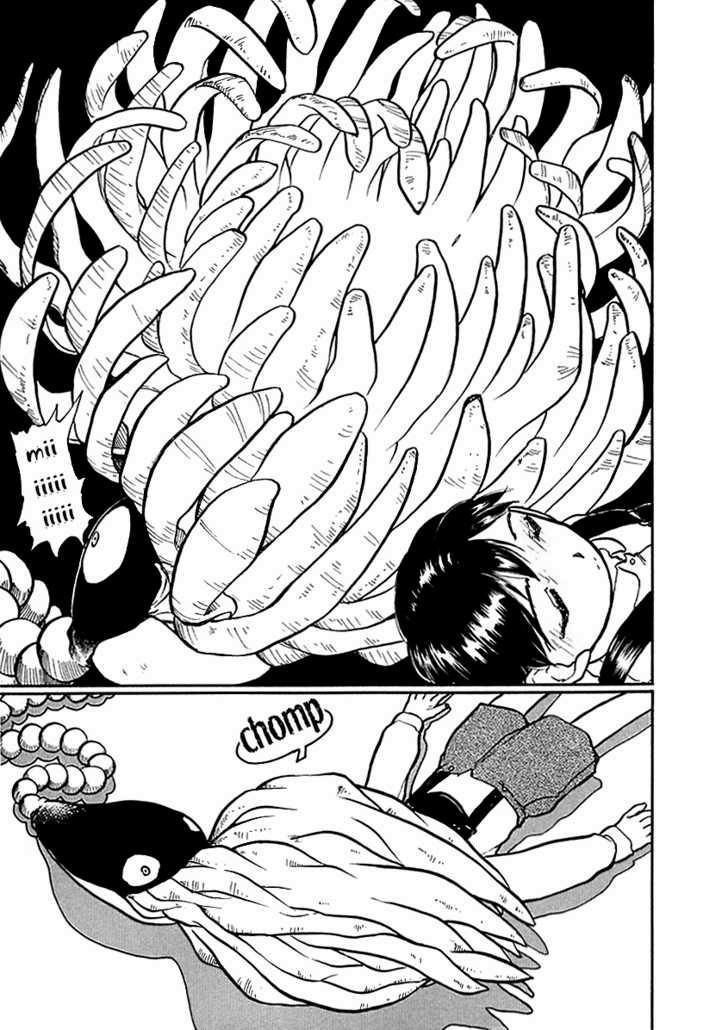 Ты ожидаешь, что остаток сюжета герои проведут, сражаясь с ними... Но тут сюжет совершает ЕЩЕ один кульбит. И как только он это делает, градус шизы вырастает даже не в разы, а на несколько порядков. Причем это не конец, с каждой главой он все выше и выше. Так, что в последних двух-трех главах у читателя начнут мозги подтекать при попытке осмыслить происходящее и собрать нити воедино. Все это сопровождается лютым психоделичным визуалом, каким не каждая хоррор-манга похвастается. Кстати, гуро тут тоже есть. Не слишком подробное, но на контрасте с кавайным дизайном персонажей бьющее по мозгам куда сильнее, чем если бы персонажи были нарисованы в более реалистичной манере.