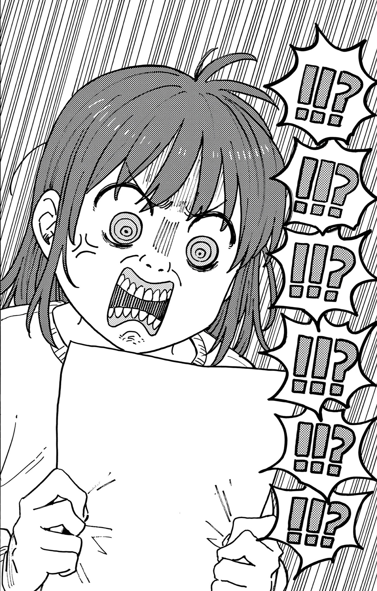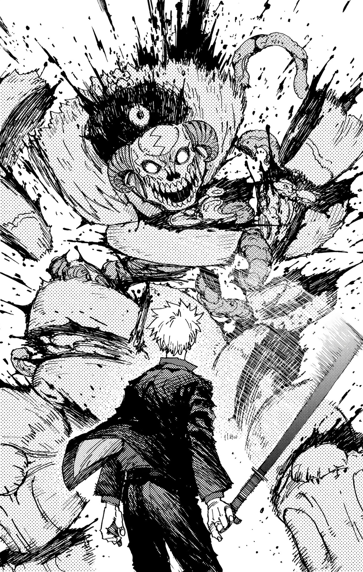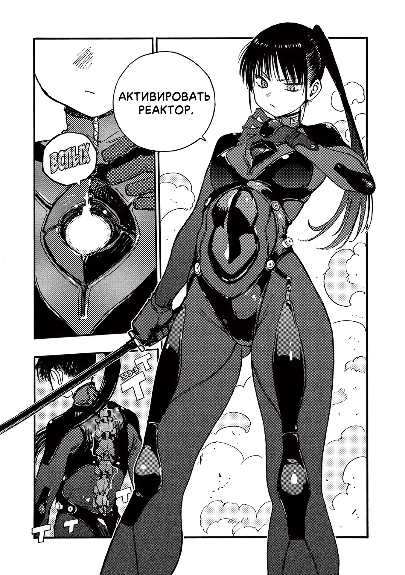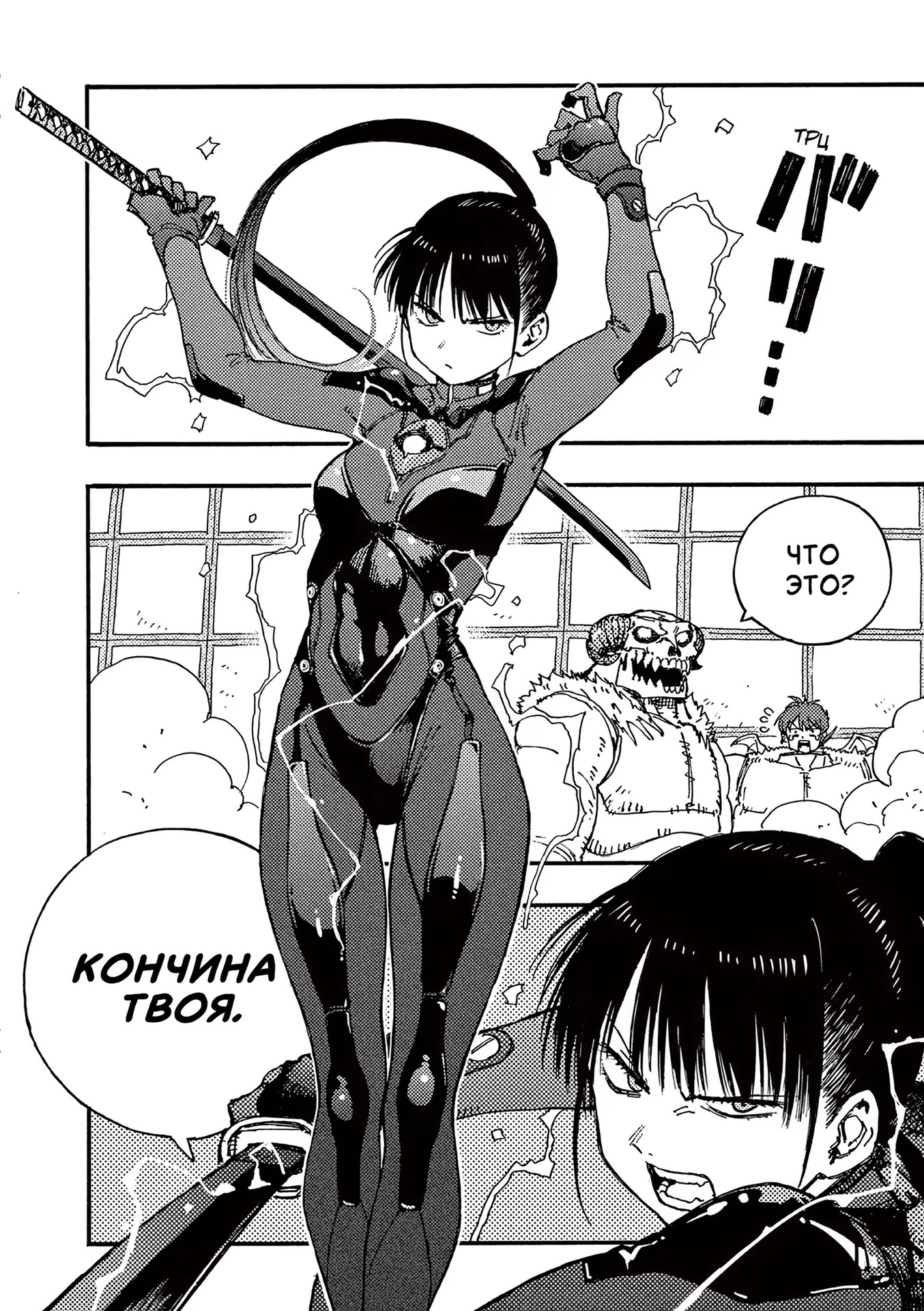 Картинки из манги. Первые три картинки из «ГромГромГром», четвертая из «Кайдзю №8» и пятая из «Ганц»