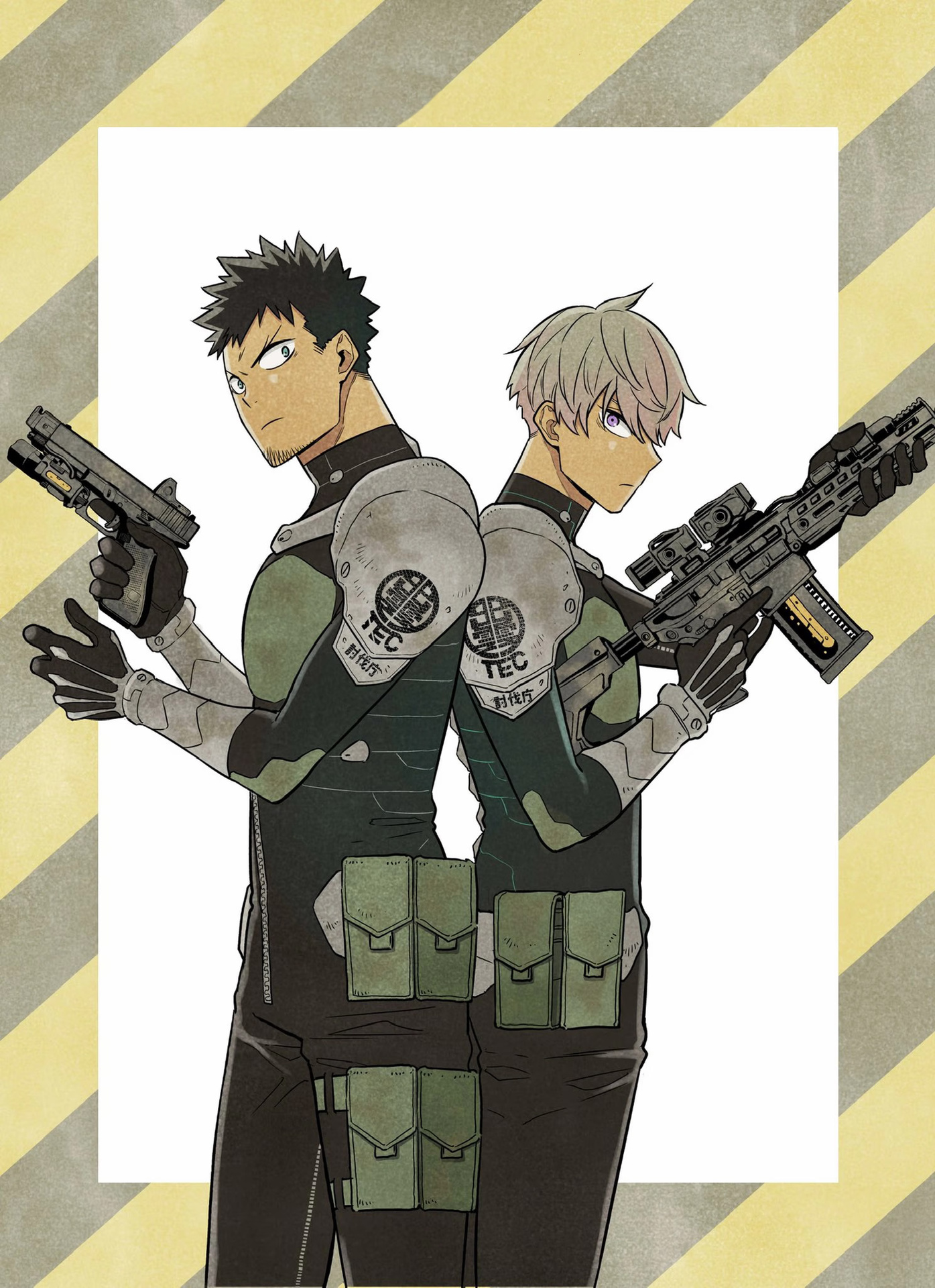 Вообще параллелей у этого произведения на другие манги встречаются часто, особенно всё с теми же «Человек-бензопила», «Ванпанчмен» и «Кайдзю №8» Вот несколько примеров. Например боевые костюмы из «Кайдзю №8», хотя если честно, визуально больше на костюмы из «Ганц» похожи, сравните арты: