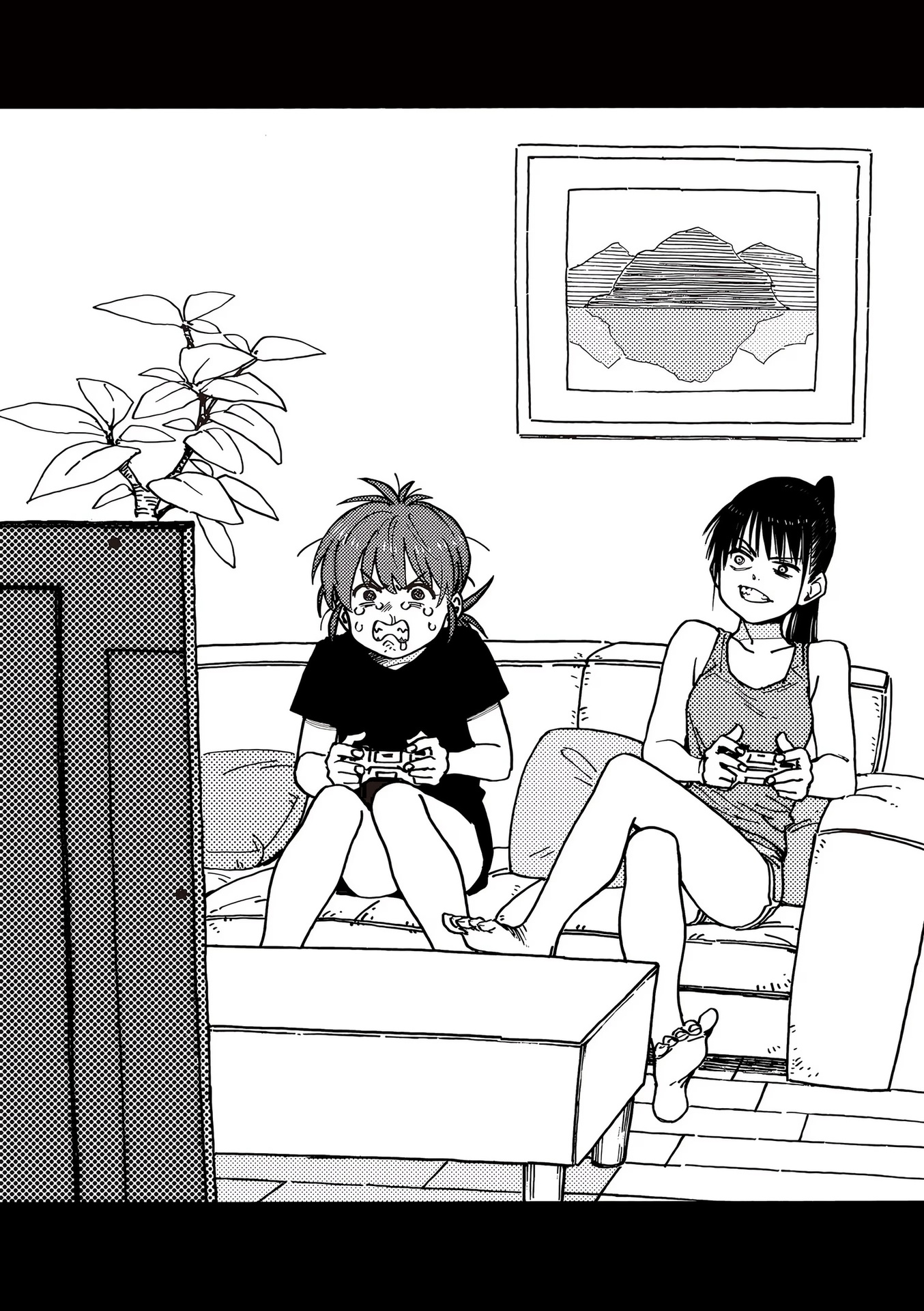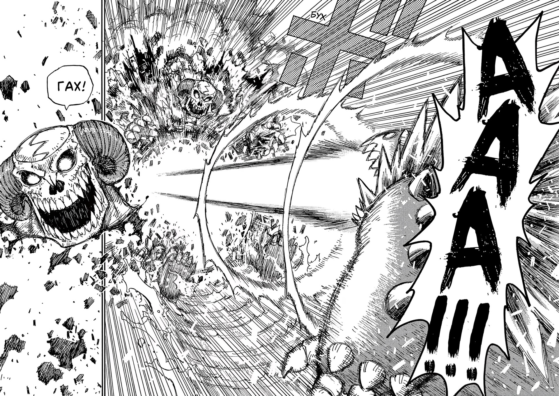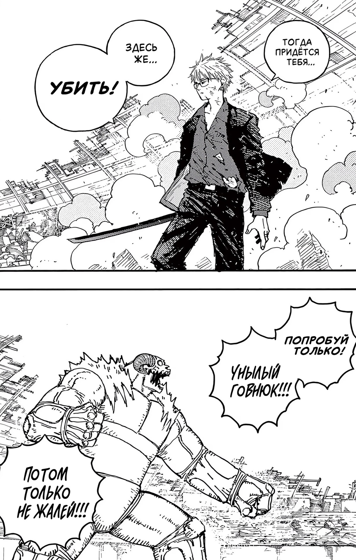 Картинки из манги. Первые две картинки из «ГромГромГром», вторая пара картинок из «Человек-бензопила»