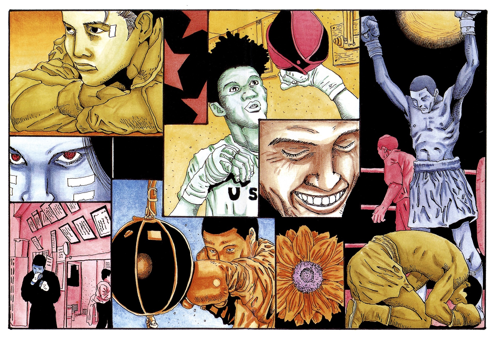 Не особо зашла последняя четверть манги, где безумие и "выше и выше". То ли это подано как-то затянуто, то ли я утратил нить повествования, но к концу на бой было скучновато смотреть. Возможно еще, что мне такой стиль рисунка не особо нравится (в отличие от более позднего стиля Мацумото - Ping PongПинг-понг), так что в нем мордобой не так интересно для меня выглядит. Хотя в целом графика красивая и интересная.