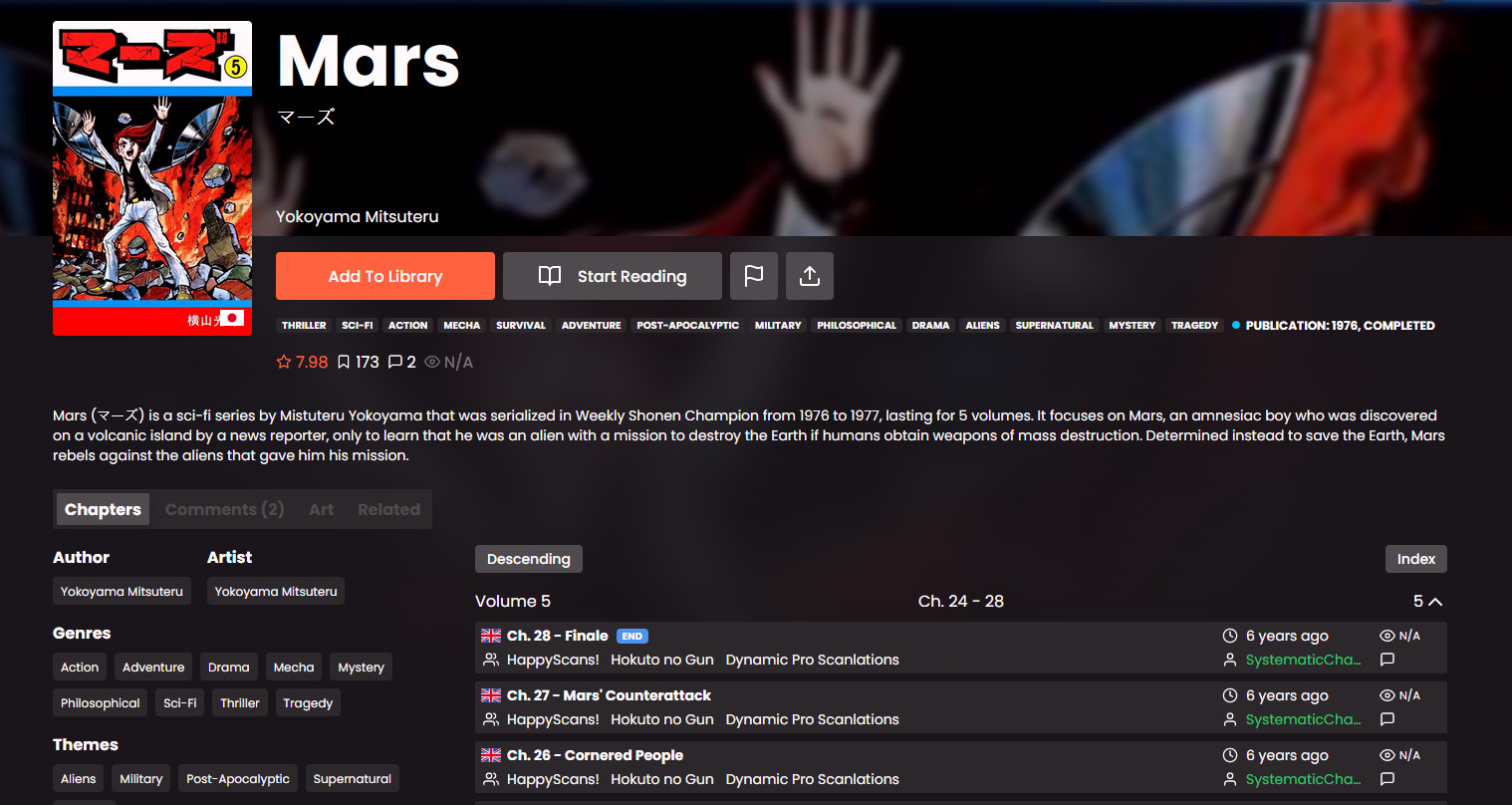 Что-то такое есть в старой манге (Марс родом из 1976 года), обаятельное что ли и наивное. Простенький рисунок персонажей с привычным для той эпохи дизайном, местами сильно детализированная техника крупным планом и тд. Может, конечно, это мне так везло, но рисунок у всех попадающихся мне сенен-манг из 70-х очень схож и типичен. Ну и содержание тут не слишком выдающееся, но при этом манга очень пытается быть остросюжетной и на серьёзных щах. Пафосность и мэрисьюшность, монстры недели и тп - клише, но их очень легко простить. Просто примите, что это - норма того времени. Для расширения кругозора прочесть точно стоит, но новичку будет явно неинтересно.