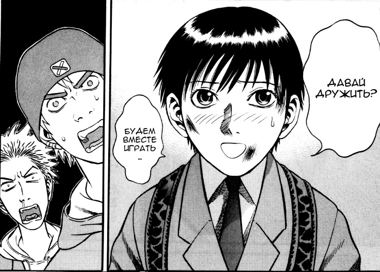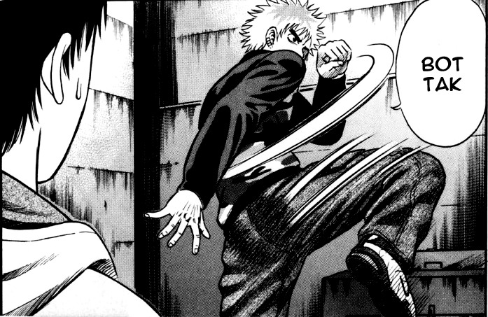 Поиски своего места в жизни и так называемой святой земли зашли слишком далеко. Почти все, без преувеличений, почти все арки строятся по нескольким шаблонам. Шаблон А: кто-то вредит кому-то из друзей Ю; Ю врубает режим берсерка и ломает лица виновным. Шаблон Б: какой-то крутой чел, ищущий драки, находит Ю и хочет с ним подраться; Они дерутся и главный герой либо выигрывает сразу, либо проигрывает, тренируется и берёт реванш, в котором выигрывает. Оба шаблона сопровождаются псевдо-философскими монологами о святой земле, которую Ю так отчаянно пытается найти, и о том, что её постоянно кто-то пытается забрать. Но всё это можно свести к простому: Ю хочет найти друзей и чтобы им ничего не угрожало, так ведь? Но ведь это не так. Ю получает тонну удовольствия от драйва на улицах; он реально зависим. Если бы всё было так просто, то, как только он нашёл первых друзей - Шина и Шого, - он бы сразу же залёг на дно, какое-то время не ходил на учёбу вместе с ребятами, постригся... Да, много чего, вариантов хватает: хотя бы перестать шататься по опасным районам, чтобы не светить своим лицом и не привлекать внимание к друзьям, к Шину, в частности, ведь с ним потом любовь Ю к уличной романтике сыграла очень злую шутку. Пошёл бы потом на бокс или что-то подобное, живя с друзьями, помаленьку развивался бы в этом направлении, но нет: Ю эгоист, прикрывающийся святой землёй и живущий себе в удовольствие, чем на эту самую святую землю регулярно наводит неприятности. Говорю я это не пытаясь кидать камни в огород арке Ю, просто мои размышления, она не плоха, хоть и однообразна. Для меня это делает её даже более глубокой, что-ли. В Ю борются желание быть на опасных улицах и желание няшиться под пледиком с тянкой и играть в дотку с пацанами, мешающие друг другу и он не выбирает что-то одно, а пытается ужиться с двумя конфликтующими желаниями сразу, это интересно.