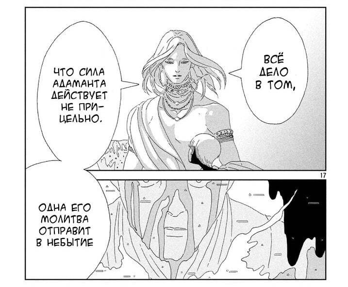 Сливают так же всю ветку взаимоотношений Каирнгорм, Призрак и Ляпис-Лазурь, первая стаёт стервозной бимбо-шмарой (по-другому не назвать), на Призрак ей (как и всем) стаёт резко плевать, и про неё никто не вспоминает, Ляпис-Лазурь чью голову приделали к Фосс, что было единственным подобным случаем и казалось должно как-то сильно отразиться на главной героине и дальнейшей истории, просто один раз ей приснилась и дальше никак не фигурировала.