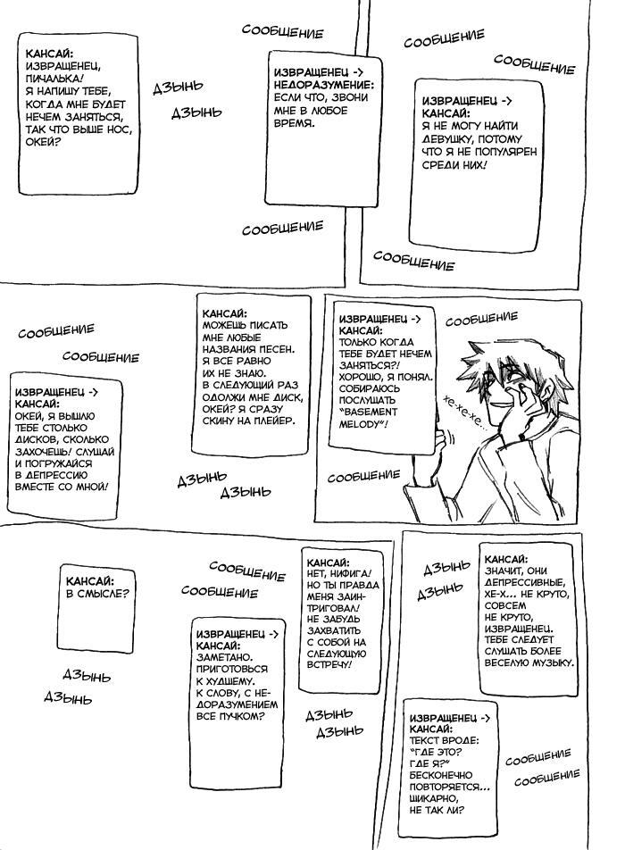 Это не совсем манга в классическом понимании – это, скорее, полноценная книга с большим количеством иллюстраций. Серьёзно. Тут основной упор здесь сделан на текст, который представлен в виде монологов и диалогов, у которых нет ни начала, ни конца. Его столь много, что невольно вспоминаешь Льва Толстого. Не то, чтобы это плохо, но не каждый способен мириться с этим фактом. Отчего рисунок, выполненный в скетчевом арт-стиле с многочисленными отсылками к таким работам, как «JoJo» (что автоматически помещает его под надзор фонда Спидвагона) или к «Новой технике говносупа» ( 0_о ), встречается довольно выборочно. В результате примерно половина или даже более страниц воспринимаются чтивом в чистом виде. Бывает, что нарисованы всего лишь три изображения главного героя да экран, представленный в виде сообщений и комментариев. Клоню к тому, что читать ради визуала – определённо не стоит, ибо главная цель произведения – показать через текст мышление главного героя: его принципы, мотивацию, ход рассуждений.