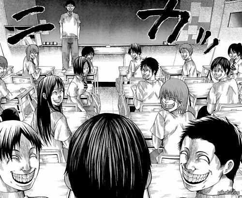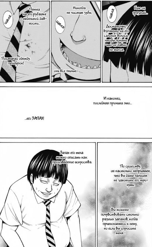 Такие лица вызывают дискомфорт, что и делает манга. Чего стоит та самая сцена с классом. Неудобство и дискомфорт в манге конечно проявляется не только в страшных моментов, но большая из этих частей работает. И, не отходя от темы, манга не позиционирует себя как сверхъестественное, хотя в жанрах указана. Она близко к реализму, ибо на некоторые вопросы о странности происходящего забываешь в конце, так как именно к этому моменту нам и объясняет всё и проявляется детективная составляющая произведения. Что это за монстры? Почему они убивают людей, и делают из них таких же монстров? И теперь мы плавно переходим к последней части.
