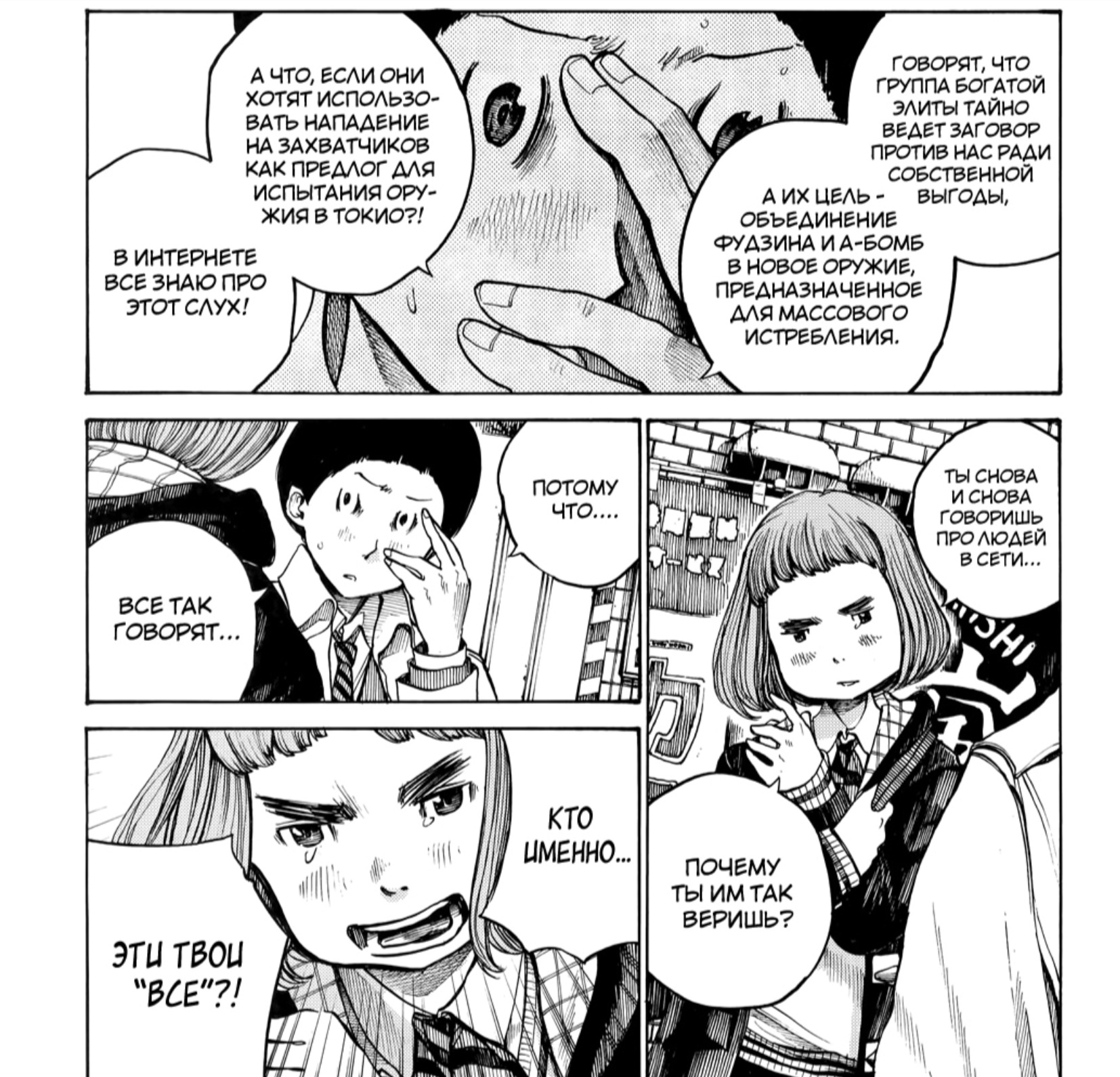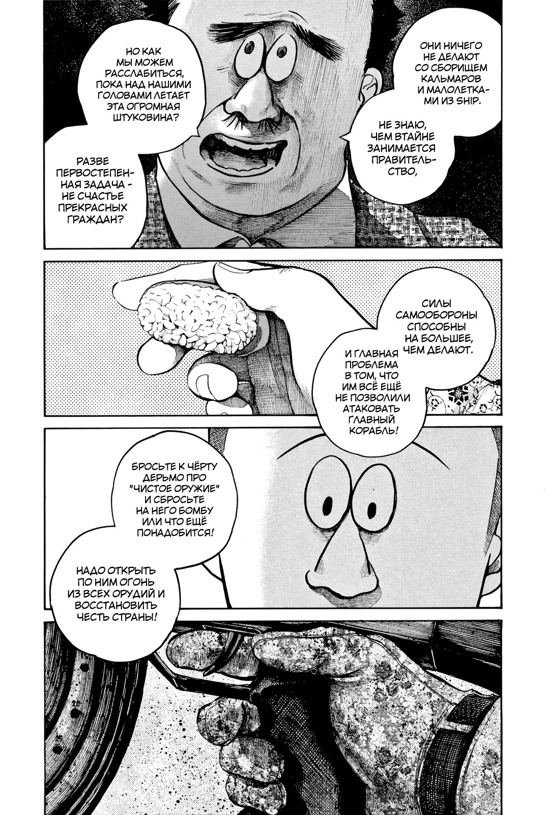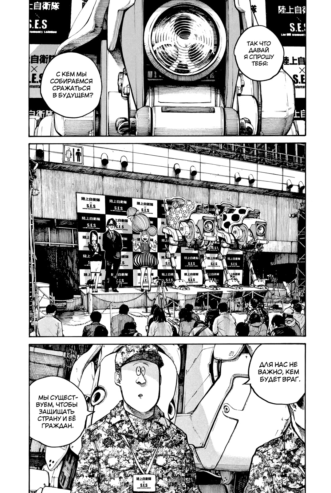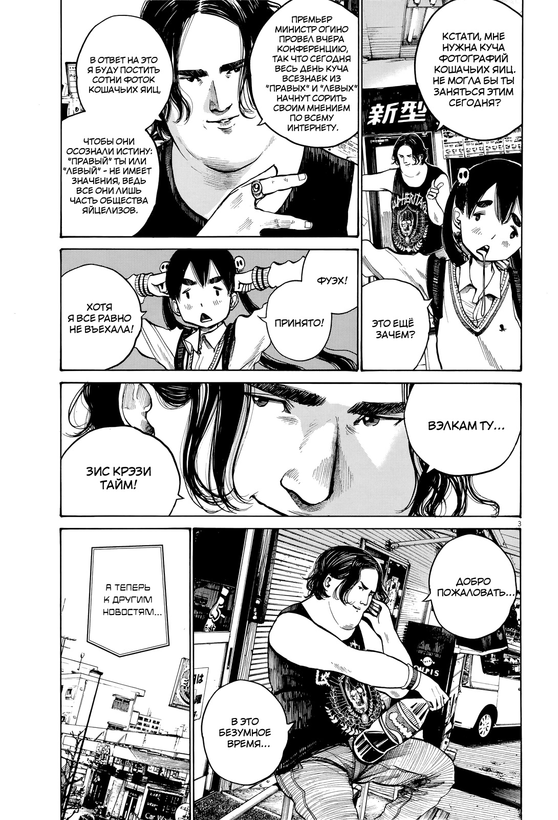 Так же в этой манге очень много критики в адрес политиков и сми, то как они манипулируют информацией и сознанием населения, через монополию контроля сми. Например как они прячут политический скандал, выпуская сразу же скандал с айдолами, чтобы люди переключились на новую тему, такое ещё высмеивалось позже в фильме «Не смотрите наверх» 2021г. Или как просто поднять моральный дух псевдопатриотов громкими речами, которые те вообще не понимают как тут например: