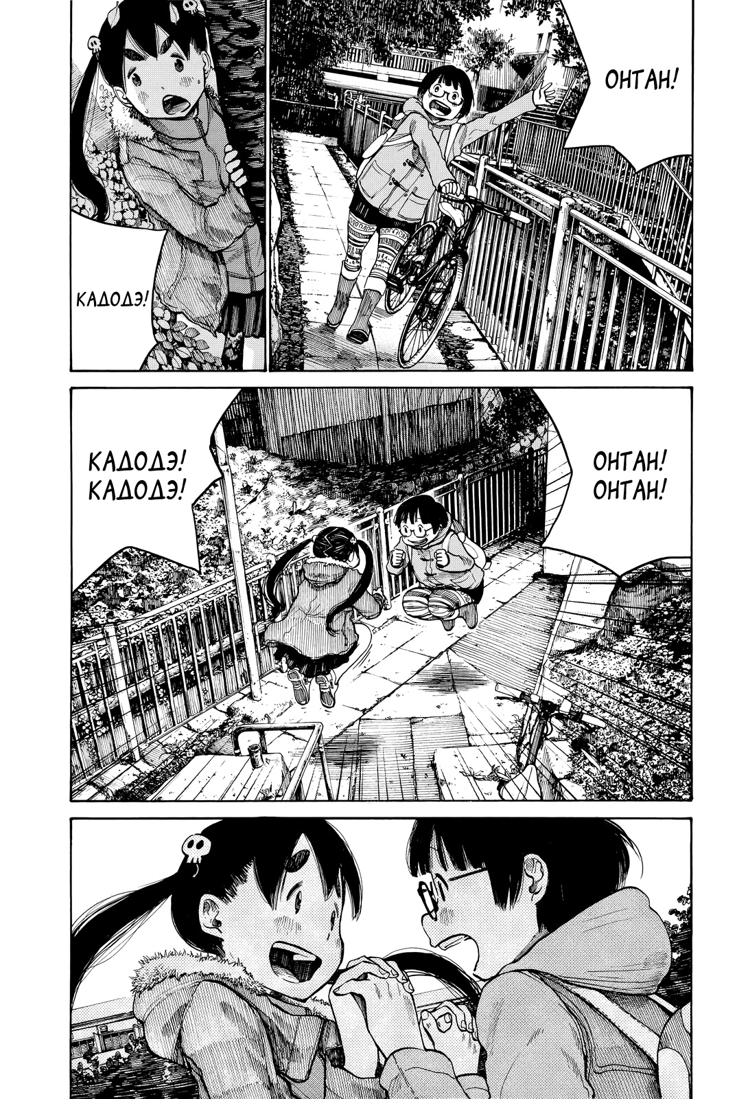 Манга начинается с нашим знакомством с главными героинями с эксцентричной и энергичной Оран, она же Онтан, а так же с тихоней и вообще самой обычной и правильной что есть девушкой, но также позволяющая дать вслед за подругой ебанца, Кадодэ. Вот и они, думаю сами догадаетесь кто есть кто)