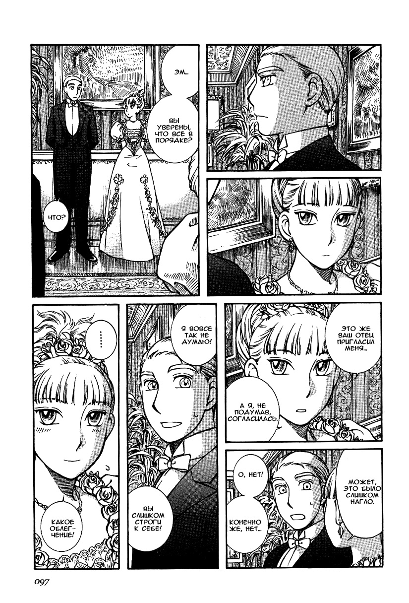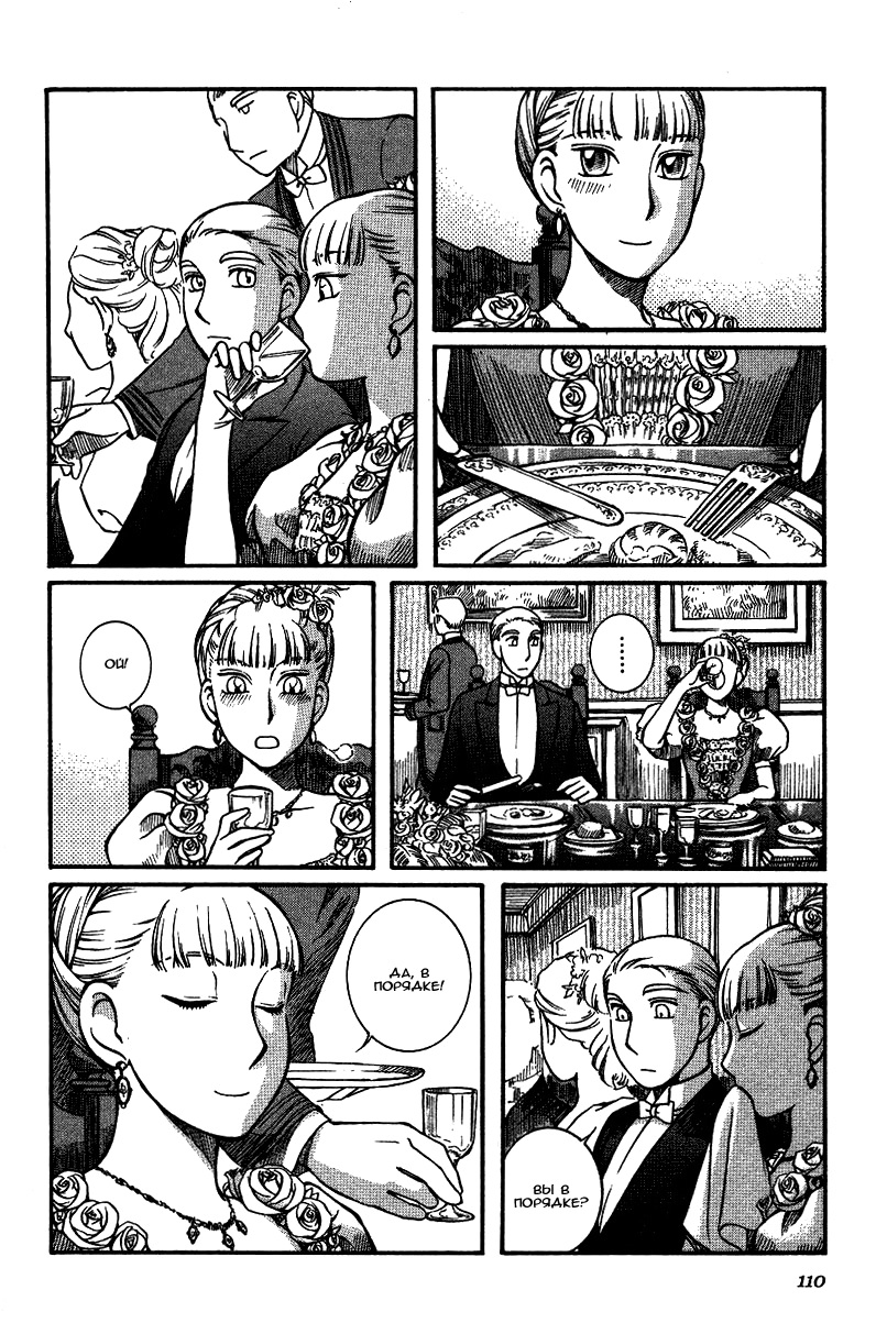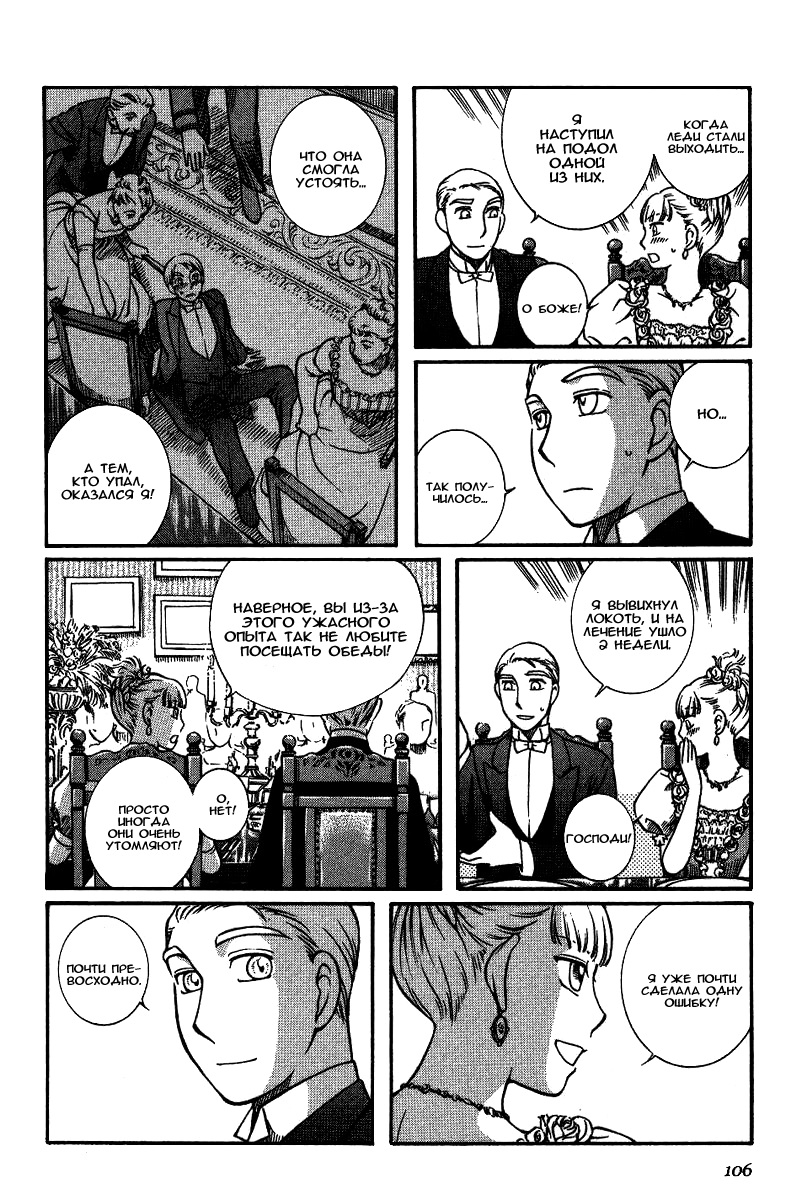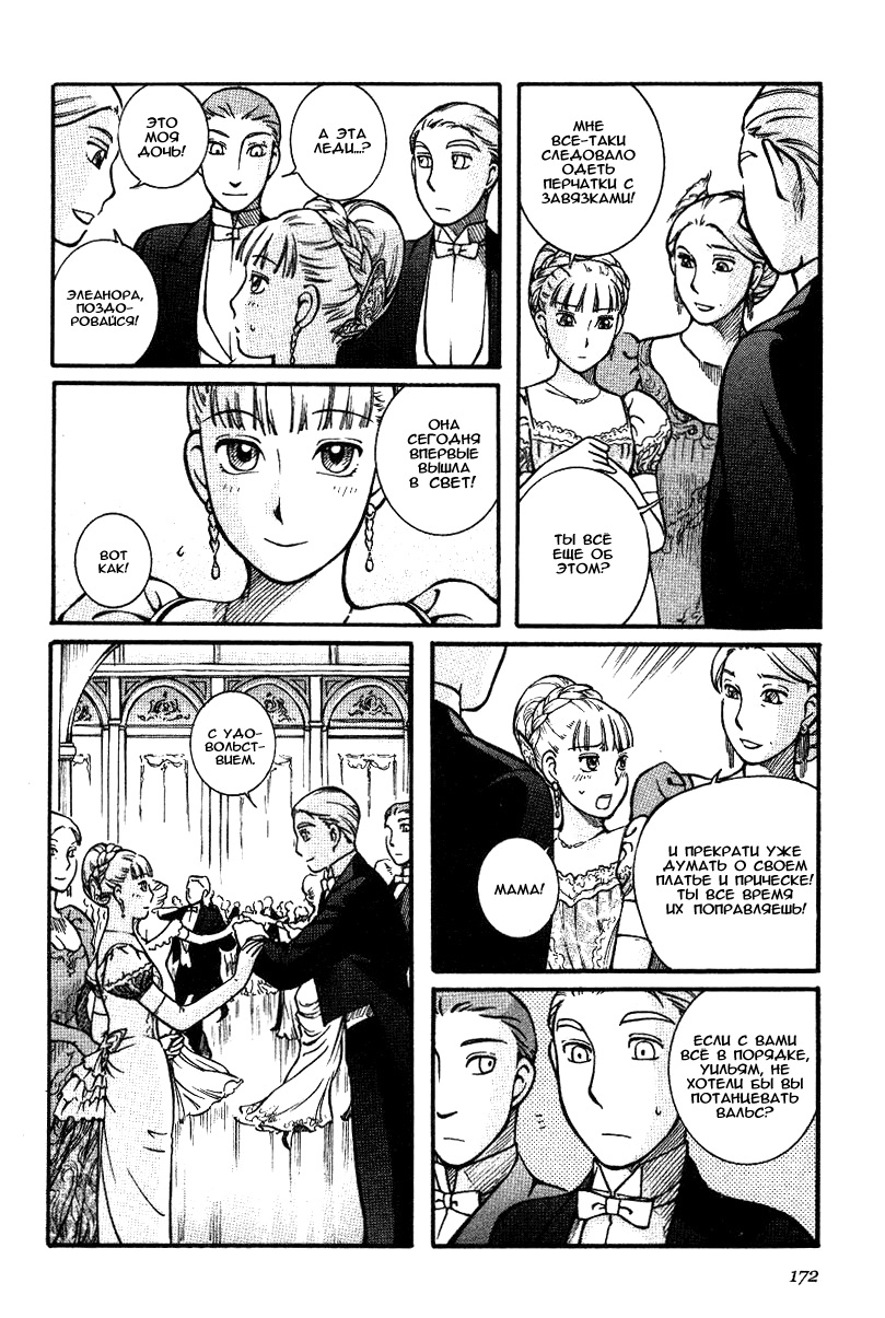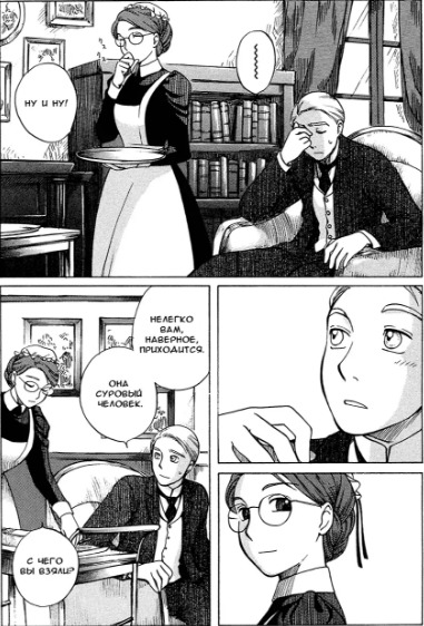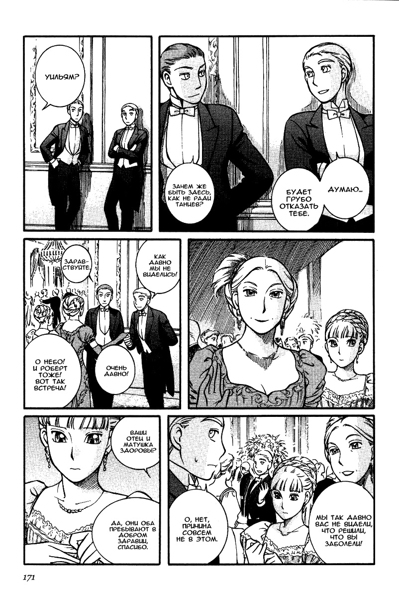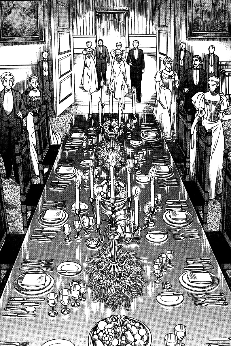 Однако если все так, то чем же мне понравилась эта манга, что я аж отзыв решил написать по ней? А понравилось мне как тут очень атмосферно и правдоподобно показана жизнь и быт людей проживающих в ту эпоху. Ну как правдоподобно, тут нету чернухи, где обычные рабочие напиваются и бьют женщин и детей, а господа не перетрахивают всех своих служанок и имеют уйму бастардов, так что правдоподобно с положительной стороны показано, немного с детской наивностью) Как и говорил ранее это очень доброе, тёплое и уютное произведение) Например мне очень нравится как показаны тут балы, как о том о сём говорят аристократы по типу охоты или магазинчиков, как молодые люди нервничают во время своего первого выхода в свет, как друг друга знакомят с новыми лицами и обретают новые знакомства для будущих дел или женитьбы и так далее по мелочи, что в целом неплохо нас погружает туда.