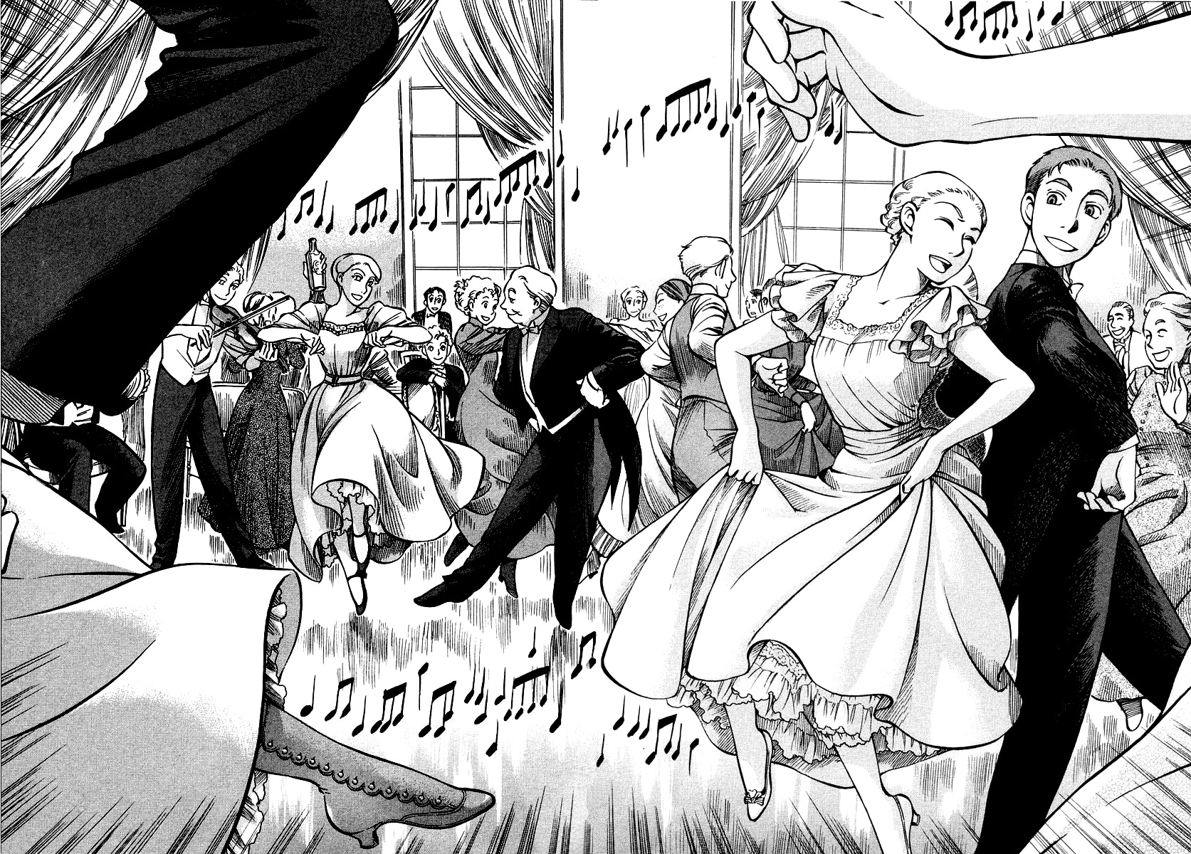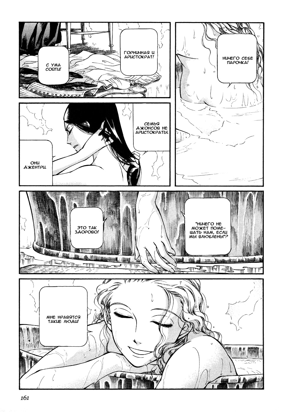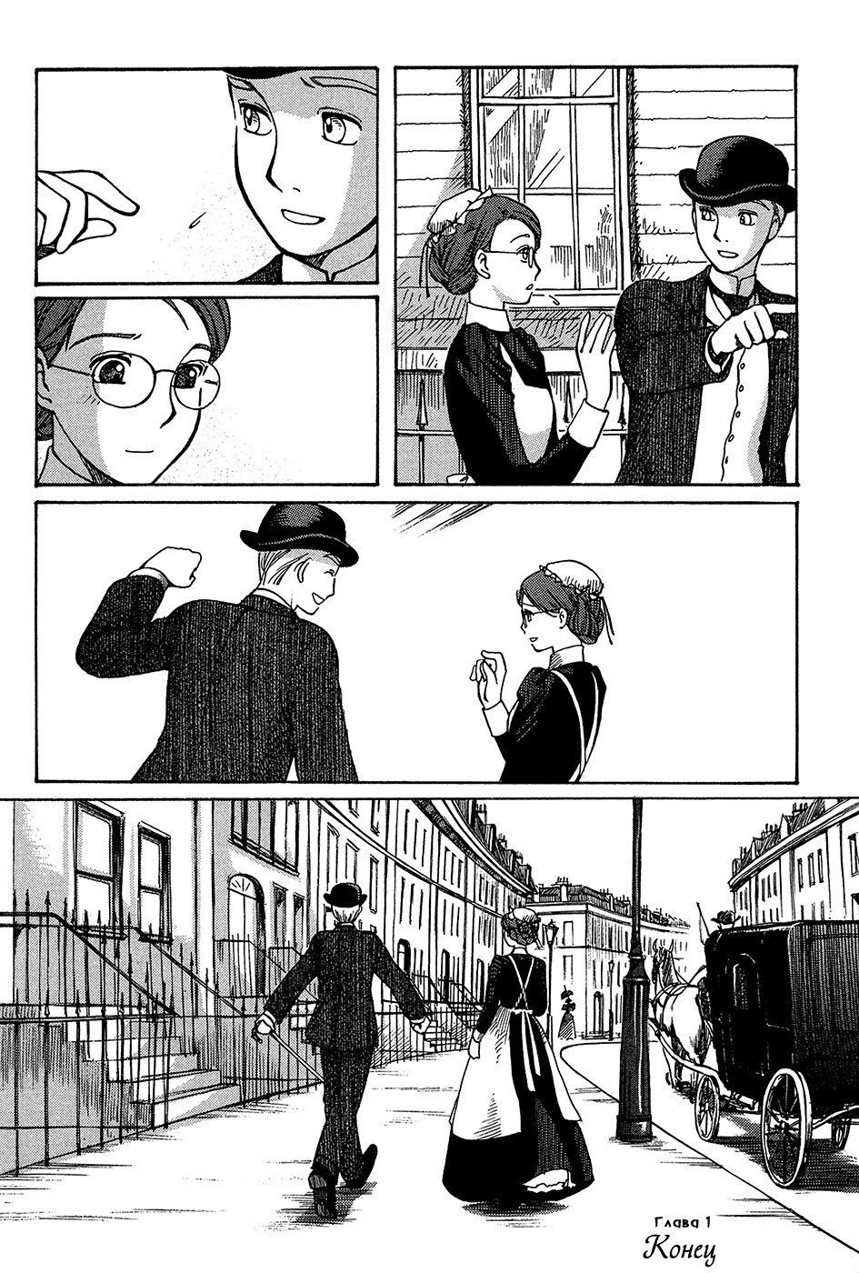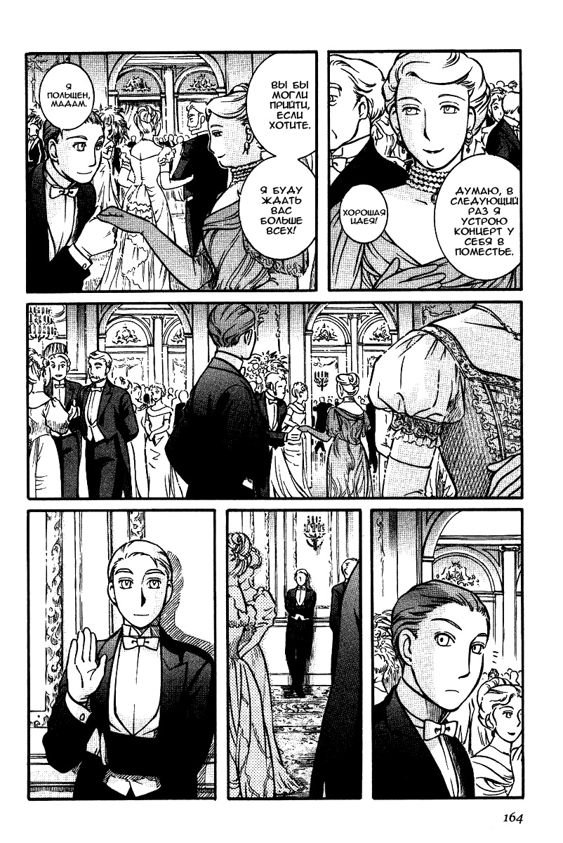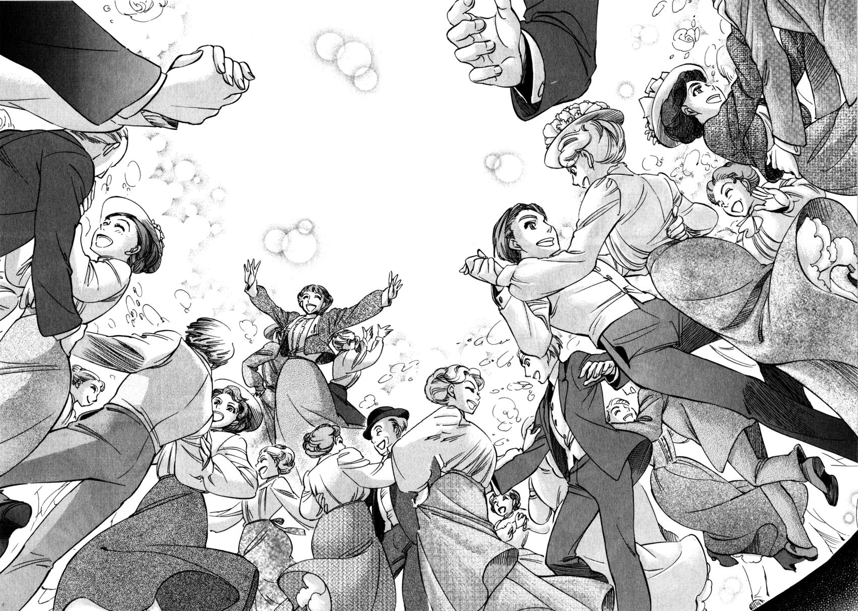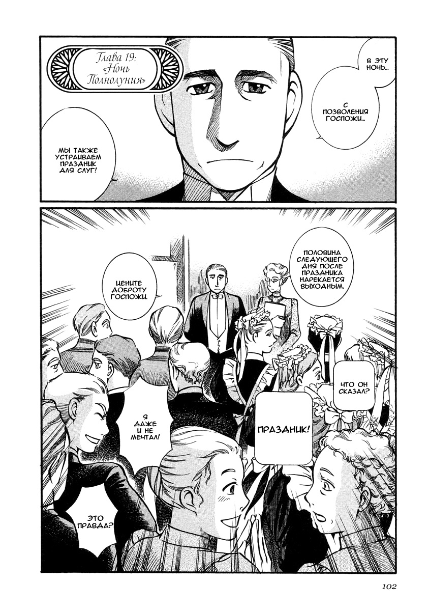 Однако если все так, то чем же мне понравилась эта манга, что я аж отзыв решил написать по ней? А понравилось мне как тут очень атмосферно и правдоподобно показана жизнь и быт людей проживающих в ту эпоху. Ну как правдоподобно, тут нету чернухи, где обычные рабочие напиваются и бьют женщин и детей, а господа не перетрахивают всех своих служанок и имеют уйму бастардов, так что правдоподобно с положительной стороны показано, немного с детской наивностью) Как и говорил ранее это очень доброе, тёплое и уютное произведение) Например мне очень нравится как показаны тут балы, как о том о сём говорят аристократы по типу охоты или магазинчиков, как молодые люди нервничают во время своего первого выхода в свет, как друг друга знакомят с новыми лицами и обретают новые знакомства для будущих дел или женитьбы и так далее по мелочи, что в целом неплохо нас погружает туда.