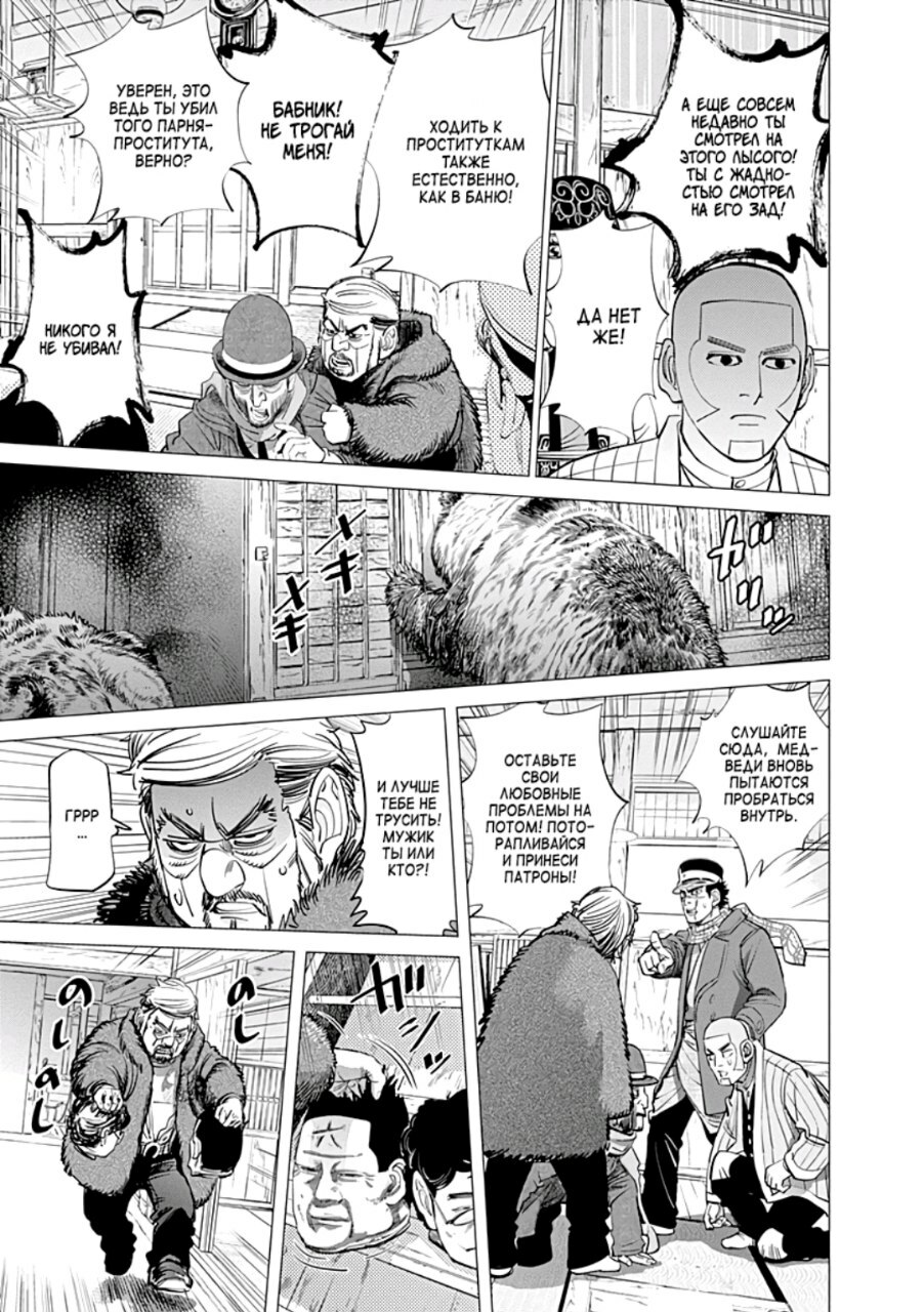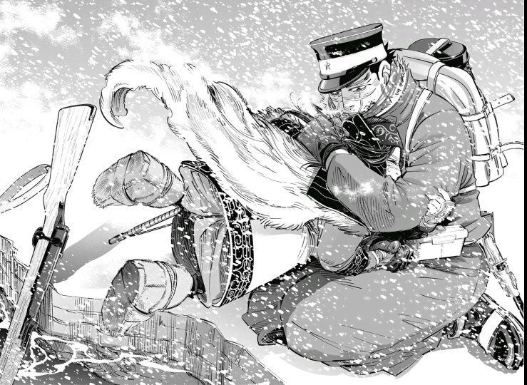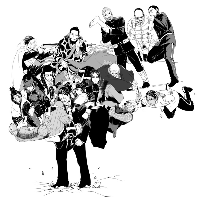 И на эту гонку за золото с НАТУРАЛЬНЫМ СДИРАНИЕМ ШКУР с заключенных (манга полностью оправдывает рейтинг 18+) участвуют сами заключенные, которых 24 и каждый с своими целями куда потратить это золото, но и правительство Японии, армия Японии, которая считает, что правительство их предало, ну и наш главный герой Сугимото вместе с девочкой айной по имени Асирпа, которая спасла его от медведя и которая оказалась дочерью одного из айнов, что охраняли золото. Вот и вся завязка столь крутой манги.
