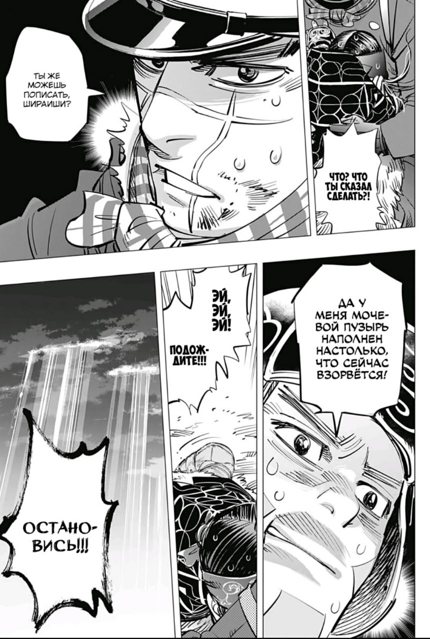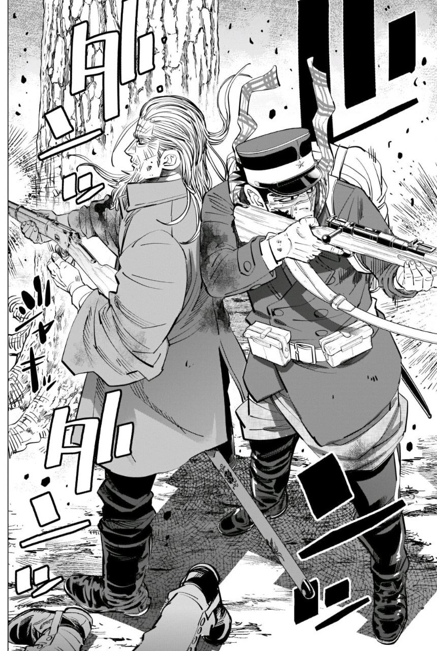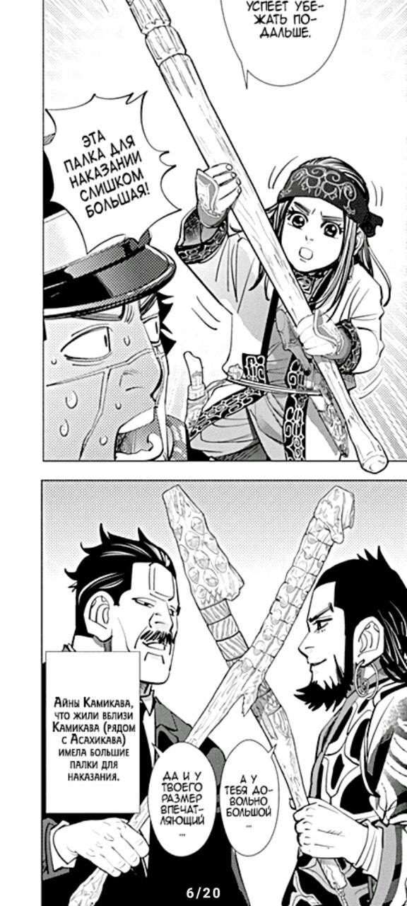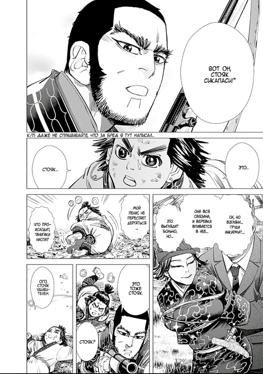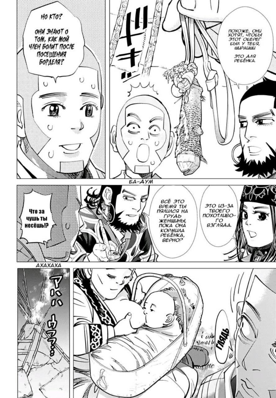 А какой тут юмор! Вы думаете тут только жесткач? Да нифига, тут лютую половину тайтла тащит именно юмор. Он тут чернушный как очко негра, пошлый и туалетный, однако бывает и милый) Тут Асирпа может угарать на Сугимото, что он есть осому (навоз), а это мисо, но она на всей протяжении манги будет считать его калоедом)