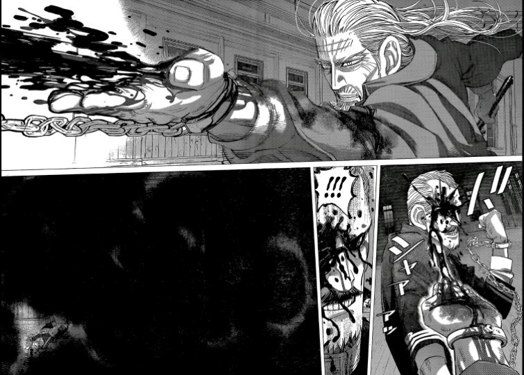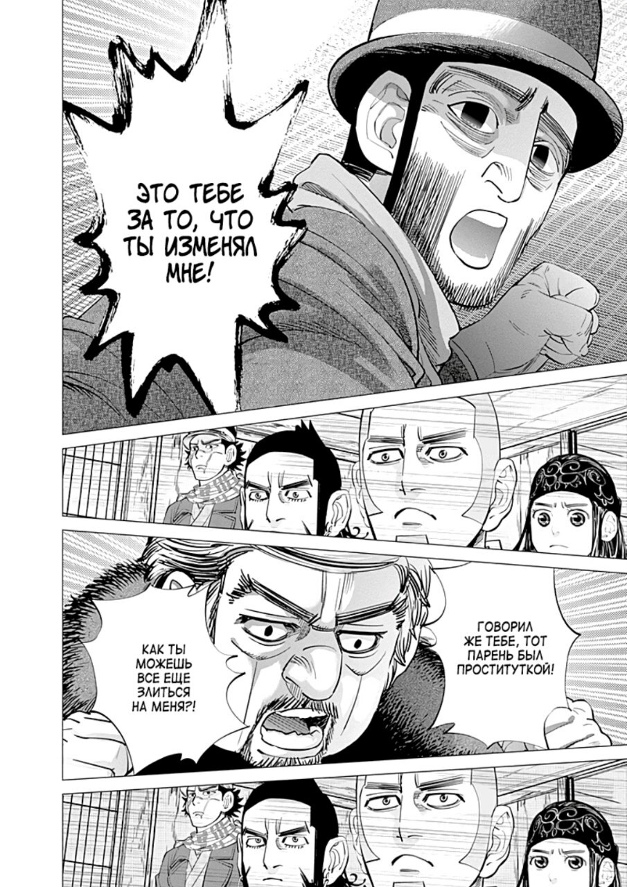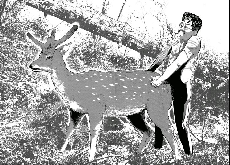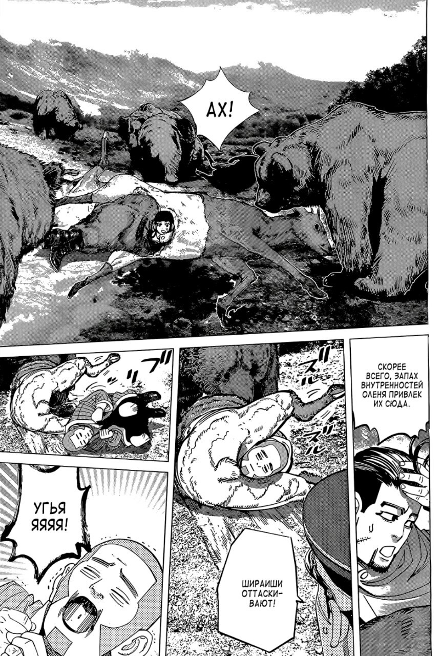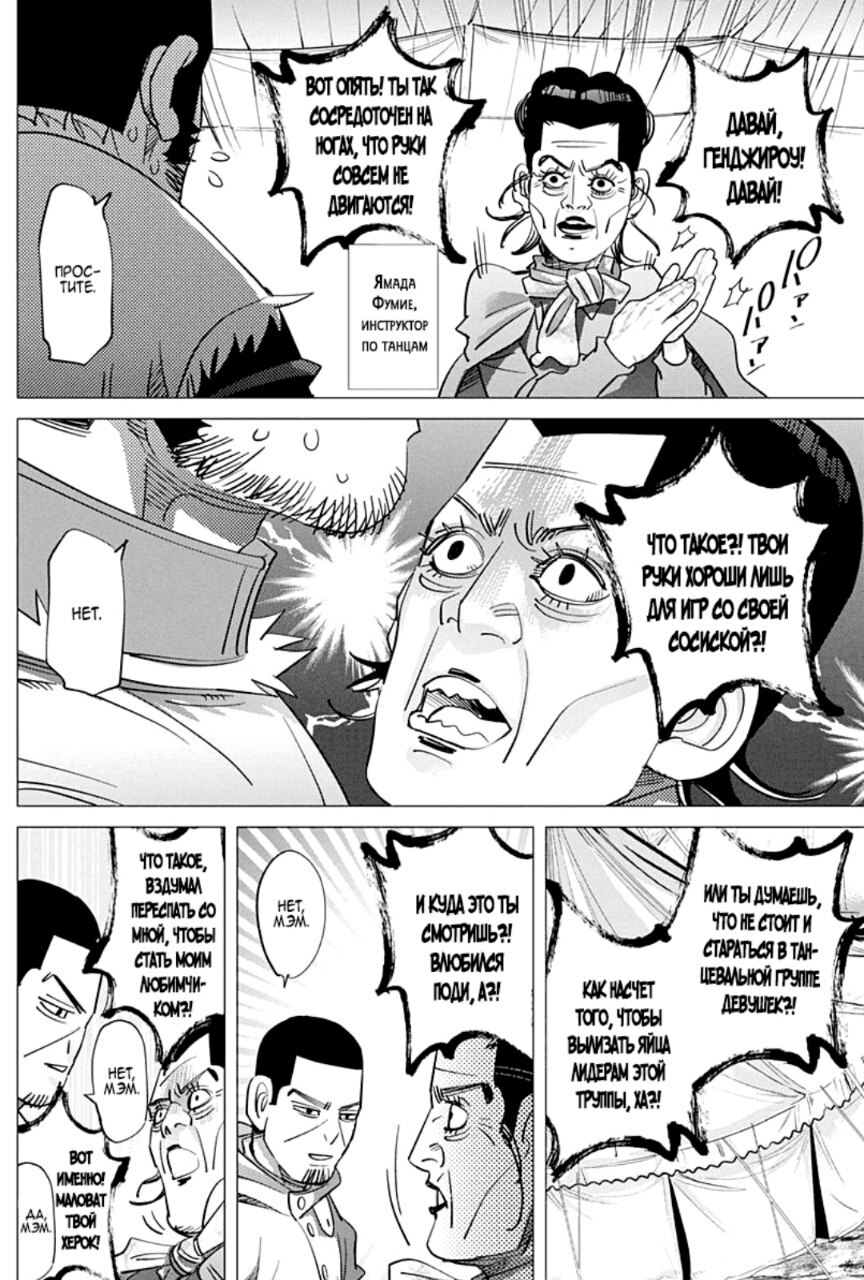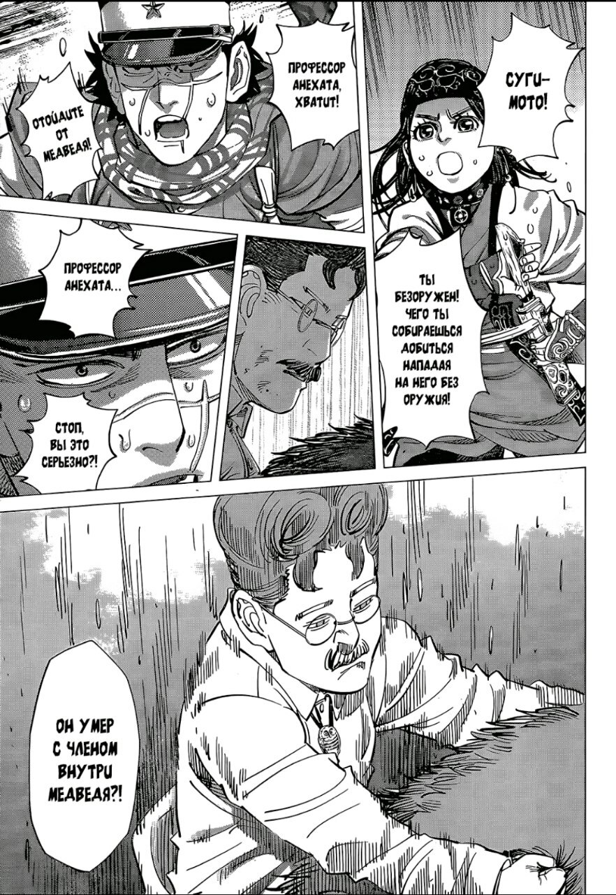А какой тут юмор! Вы думаете тут только жесткач? Да нифига, тут лютую половину тайтла тащит именно юмор. Он тут чернушный как очко негра, пошлый и туалетный, однако бывает и милый) Тут Асирпа может угарать на Сугимото, что он есть осому (навоз), а это мисо, но она на всей протяжении манги будет считать его калоедом)