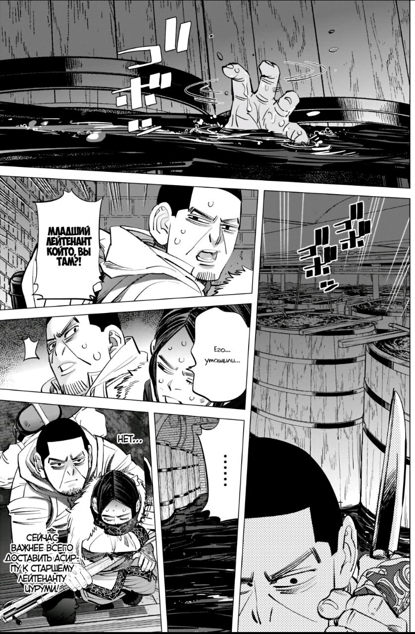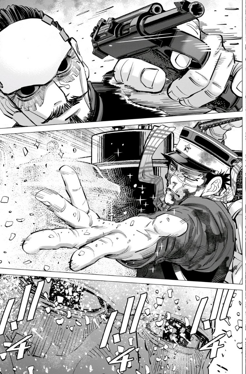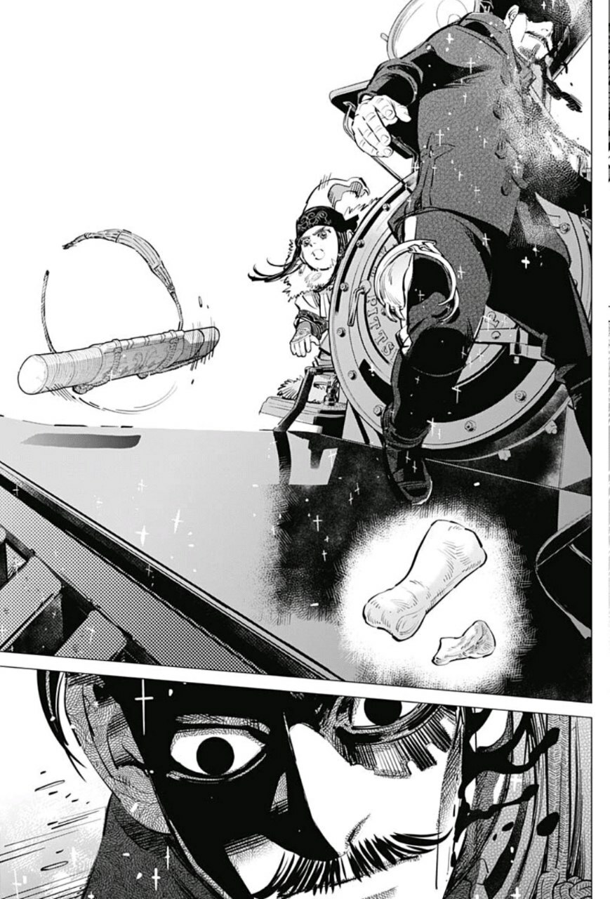 Помимо пыток от охранников к нему подсаживают самых опасных преступников с целью вынудить у него хоть какую-то информацию. И вот он без возможности передать хоть какую-то весточку на волю, этот похититель идёт на одну авантюру. Он наносит зашифрованную карту по частям на заключенных, которые с ним сидели, в виде татуировок на всё туловище и когда они сбегают, то начинается самая натуральная королевская битва за золото народа айну, а речь идёт как сначала говорилось не 75кг, а многих десятках тонн золота.