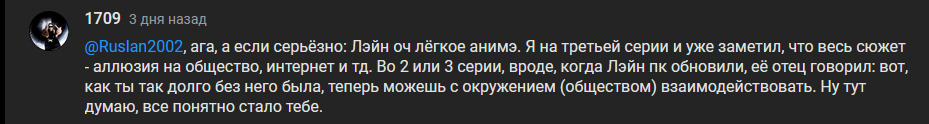 Я не знаю, каким нужно быть, извините за мой русский язык - тугодумом, чтобы не понять, что Лэйн - это аллюзия на возникновение интернета. Точнее, его проблематика. С первых серий нам это внушают, как Лэйн дали Navi, была фраза: ну так, хоть и с окружением будешь взаимодействовать в компьютере, там много друзей. Я не пересказываю её дословно, но даже тут виднеется больное восприятие "сети" у персонажей в этом тайтле. Каждый имеет свой пк, каждый, такое ощущение, что повёрнут на нём. И в редких случаях нам показывают людей, которые вообще не шарят что к чему. Помню, как сдавал единый государственный экзамен по русскому языку. В частности сочинение. У него есть структура, которую нужно составить по предложенному тексту, структура состоит из проблемы текста, пояснений к проблеме, позиция автора и собственная к данной проблеме. В каждом художественном произведении есть проблематика. Достоевский "Преступление и наказание" - проблема совести у людей. Эксперименты Лэйн - проблема развития интернет структур или же вхождение сети в наш реальный мир, как нечто важное. И почти каждый персонаж представляет проблематику, которую автор хочет разобрать: все повернуты на сети, даже папа Лэйн относится к этому, как к инструменту взаимодействия с людьми словно ирл. Вот и все, я разобрал весь, как вы говорите, - "глубинный смысл тайтла", на который вы так жалуетесь.
