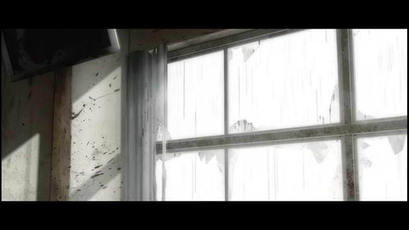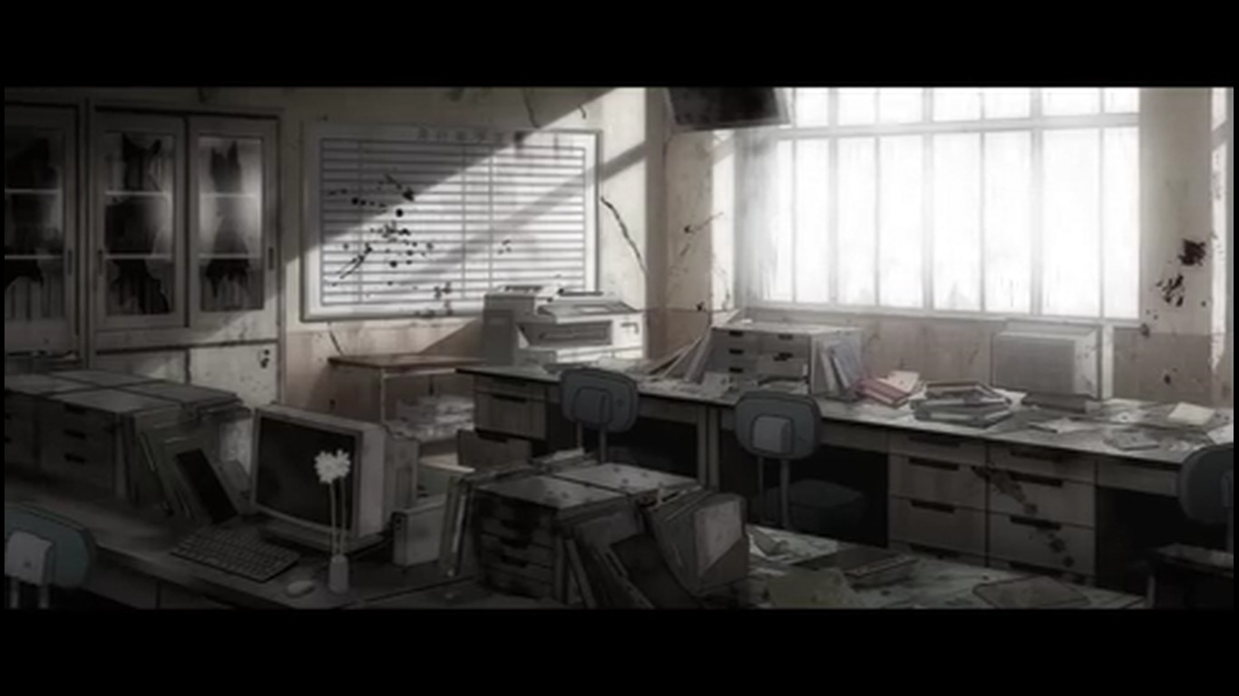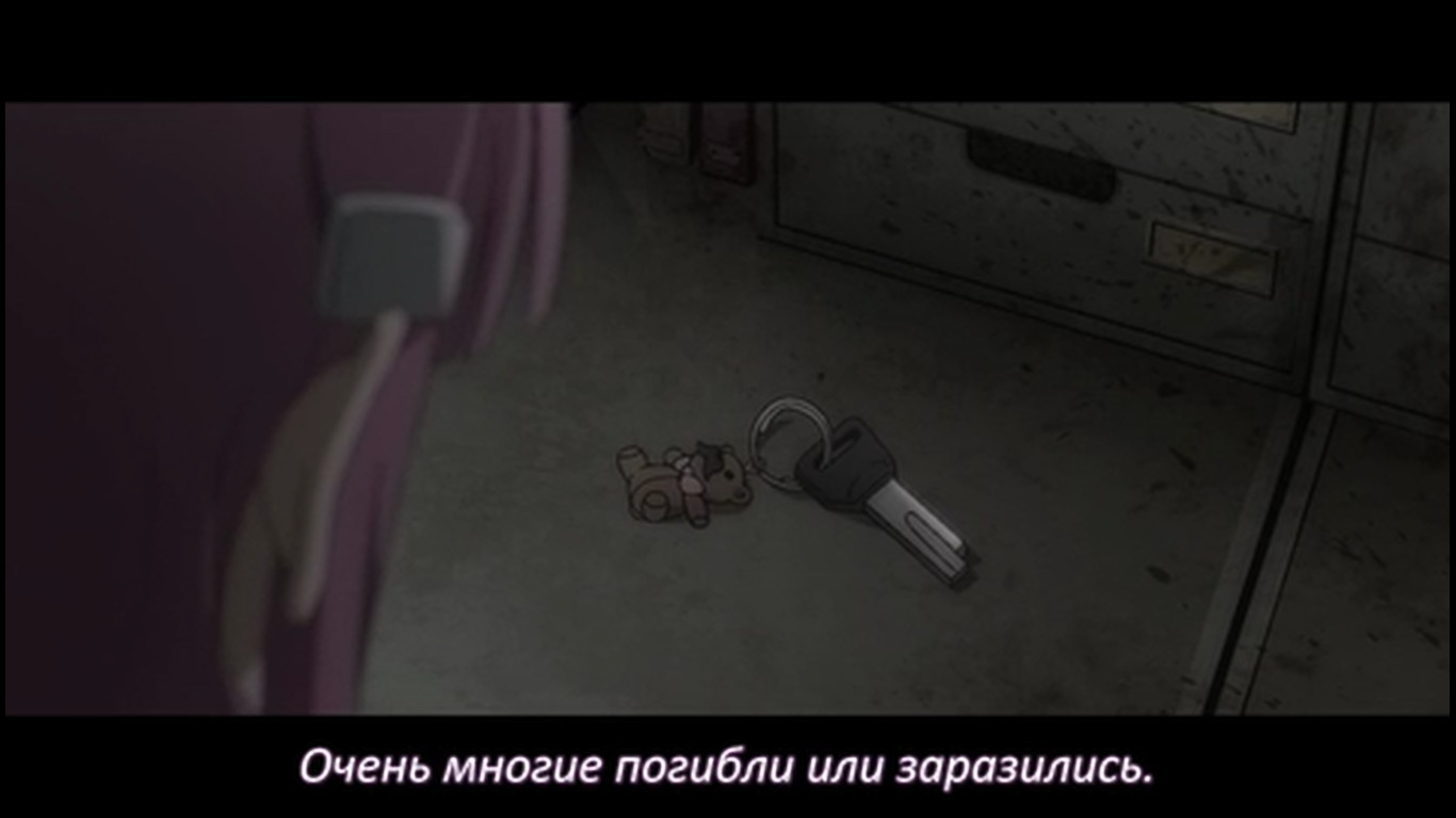 22:25 - Такой же переход, как на 16:10. Только с выключением проектора в виде белой вспышки и полностью чёрным экраном. Этой вспышки в тот раз не было, потому что это был не конец серии / показа воспоминаний. Получается тайтл In medias res, т.к. изначально показывали уже их будни в зомби апокалипсисе, но показали как он начался лишь в 3 серии