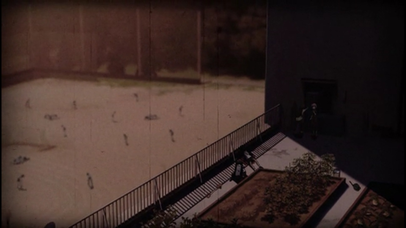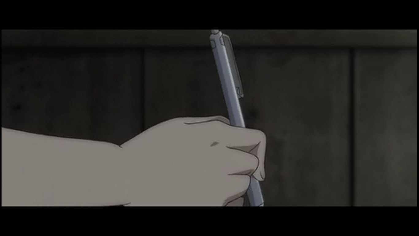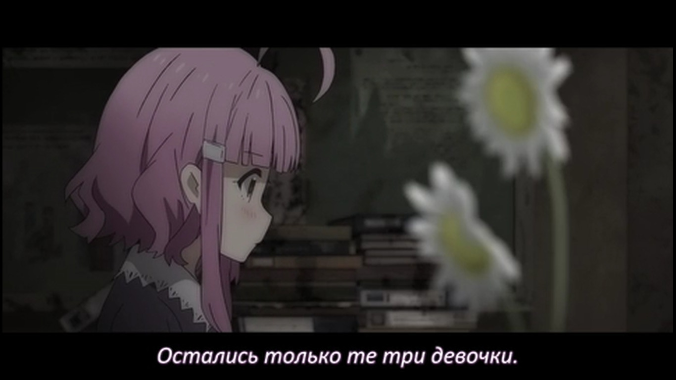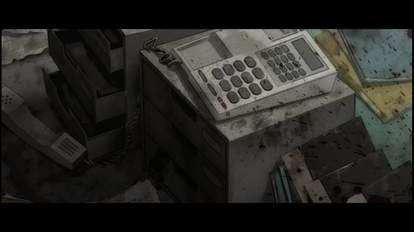 22:25 - Такой же переход, как на 16:10. Только с выключением проектора в виде белой вспышки и полностью чёрным экраном. Этой вспышки в тот раз не было, потому что это был не конец серии / показа воспоминаний. Получается тайтл In medias res, т.к. изначально показывали уже их будни в зомби апокалипсисе, но показали как он начался лишь в 3 серии