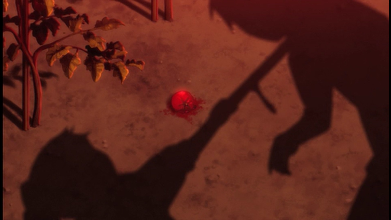 15:02 - Цензура крови через метафору расплющенного помидора, давшего сок, и капающих капель крови с лопаты, которая пронзила шею куну. 15:16 - Удар не показан - оборвался кинематографической паузой (без артефактов, как ранее) и обрывом звуковой дорожки. 15:18 - Повторение с другого ракурса. 15:20 - Повторение с другого ракурса. Закончилось всё тем, что девка в крови, а ггшка остановила её, обняв и заплакав. 16:10 - состаривание изображение - характерное дрожание экрана, звук работающего проектора, артефакты съёмки, чб-фильтр. Эффект перемотки (?) плёнки. 16:13 - ещё раз кинематографическая пауза с артефактами