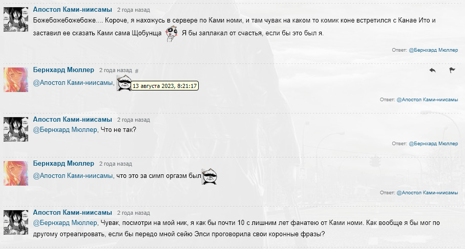 @Бернхард Мюллеp, Чувак, посмотри на мой ник, я как бы почти 10 с лишним лет фанатею от Ками номи. Как вообще я бы мог по другому отреагировать, если бы передо мной сейю Элси проговорила свои коронные фразы?@DeletedUser_696178@Апостол Ками-ниисамы,Мюллер: