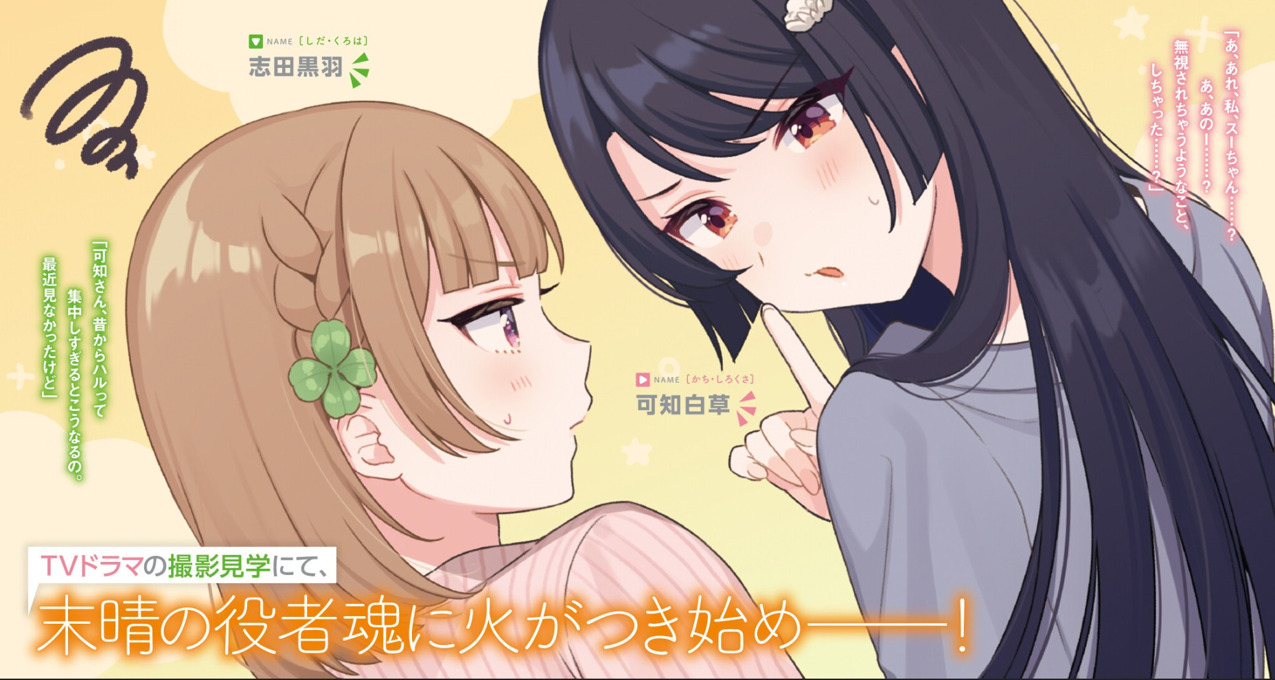 Похоже, что моя подруга детства Куроха Сида неравнодушна ко мне. Эта маленькая и милая девушка живёт по соседству. Она общительная, словно заботливая старшая сестра. Это даже можно назвать её преимуществом. Однако я уже нашёл свою любовь — прекрасного идола и первоклассного писателя старшей школы — Сирокусу Кати! Хотя вряд ли она примет моё признание. Тем не менее она разговаривает только со мной при возвращении со школы и даже улыбается! У меня же есть шанс?!
